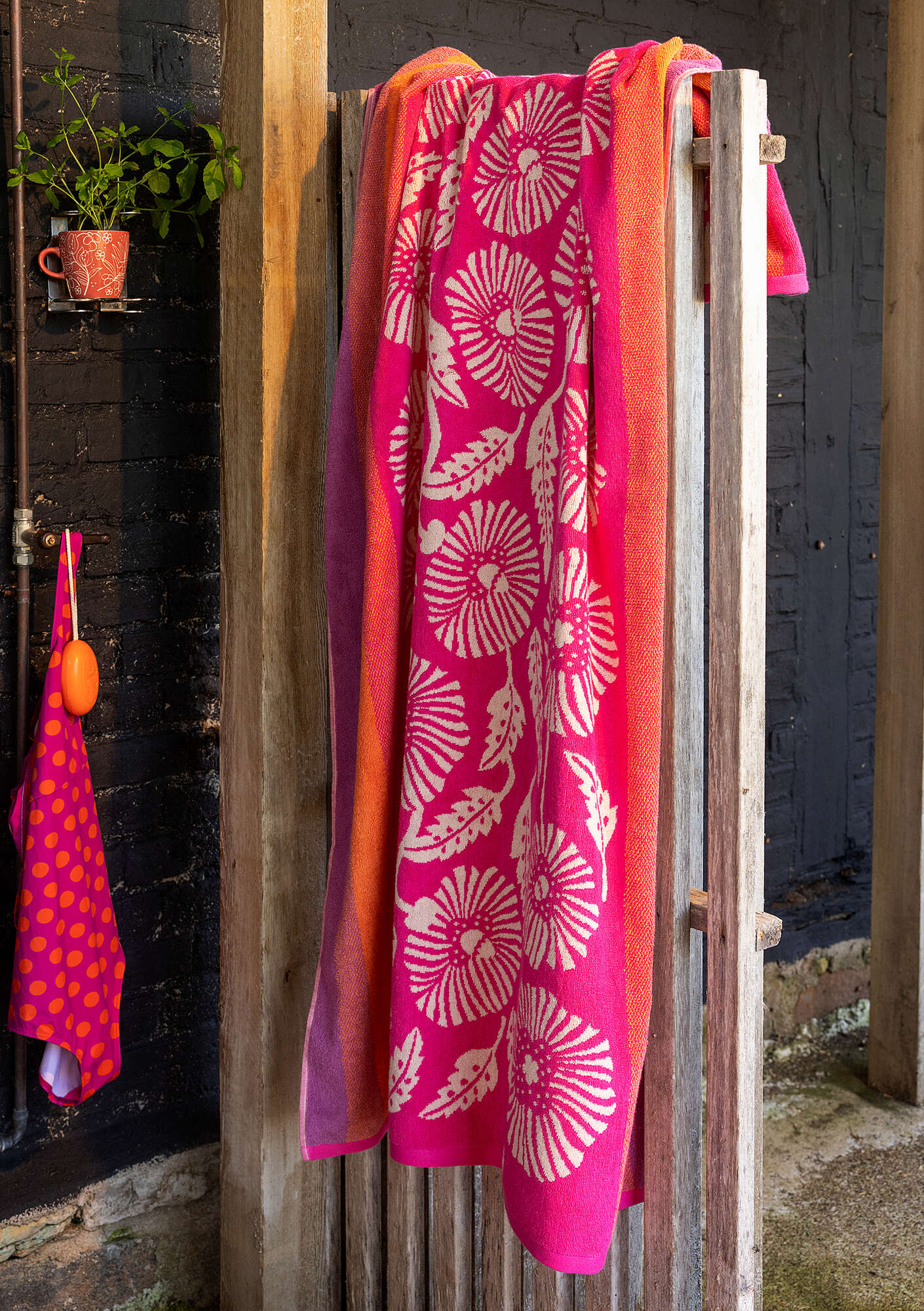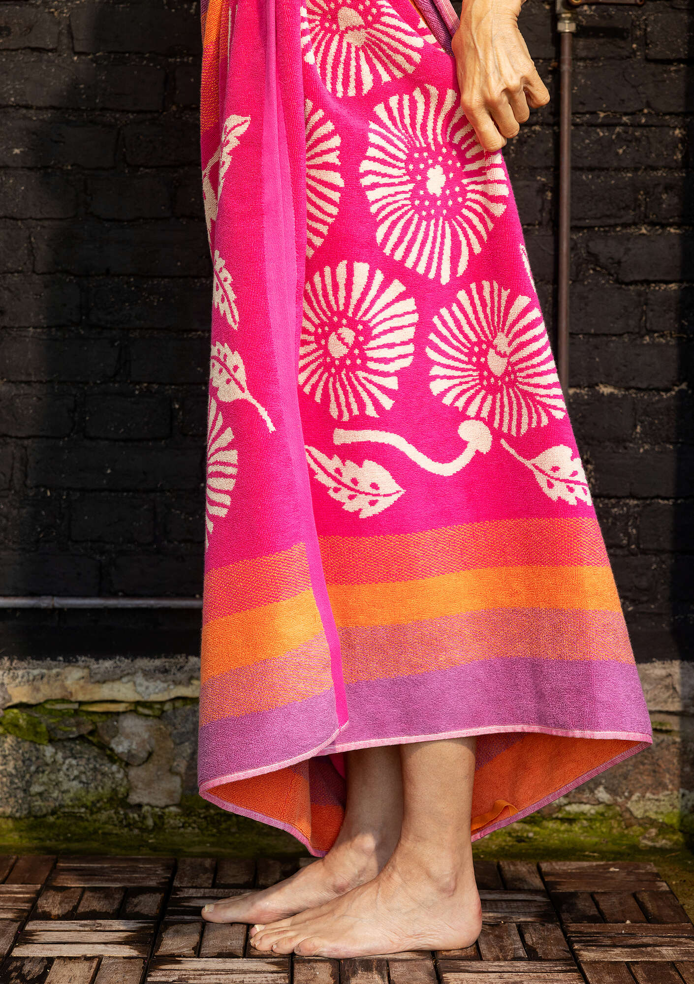- A generously sized bath sheet, with flowers and striped sides in harmonious colors. Soft and comfy terry with excellent absorbency. Contrasting color at the edge and hangers on the short and long sides.Size and Measurement