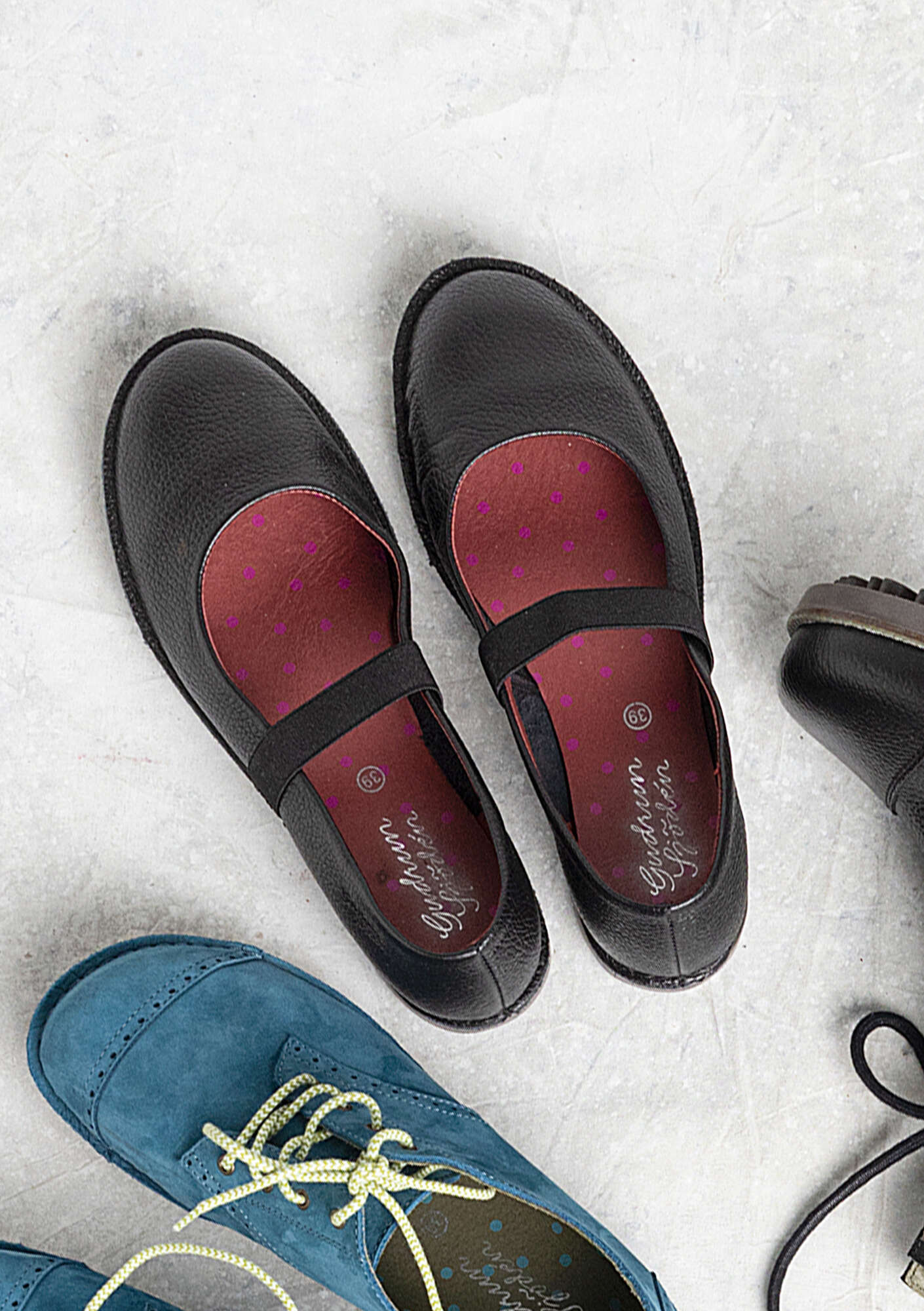 - Lovely little ballerina flats. Comfortable elastic across the foot to keep the shoe in place. Dotted insoles.Material and Production