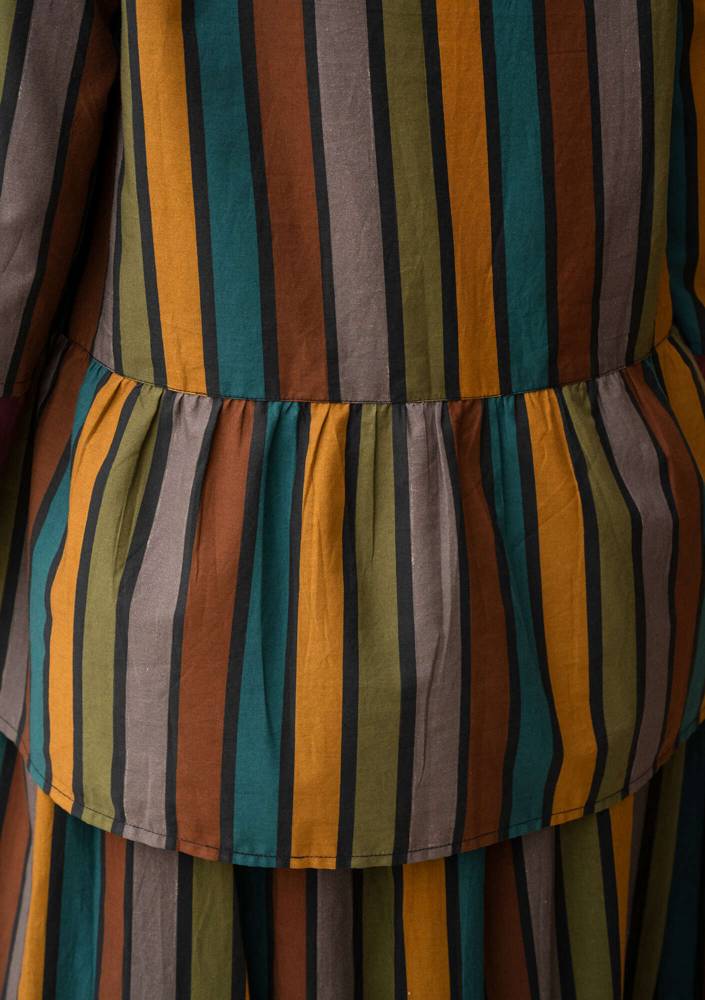 - Digitally printed blouse with a ruffle at the lower edge. Subtle boat neck. Half-length sleeves and mother-of-pearl button closure on one shoulder. Gathered seam at the waist, creating a touch of volume below.Size and Measurement