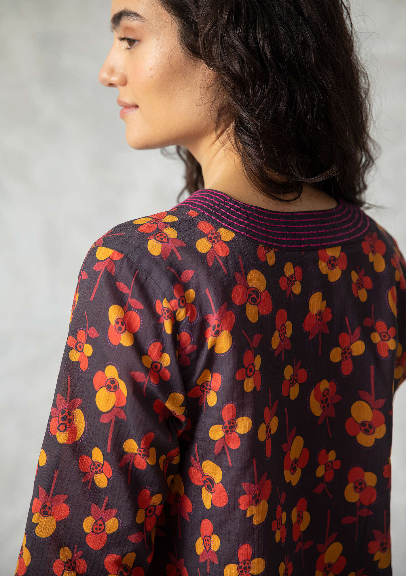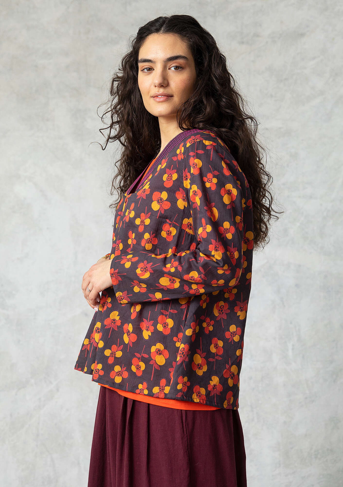 - 100% cotton. The cotton is certified organic. The garment is digitally printed and the print is certified. Machine wash warm, delicate cycle. Medium iron. Shrinkage 2-3%. Made in Faridabad, India.
