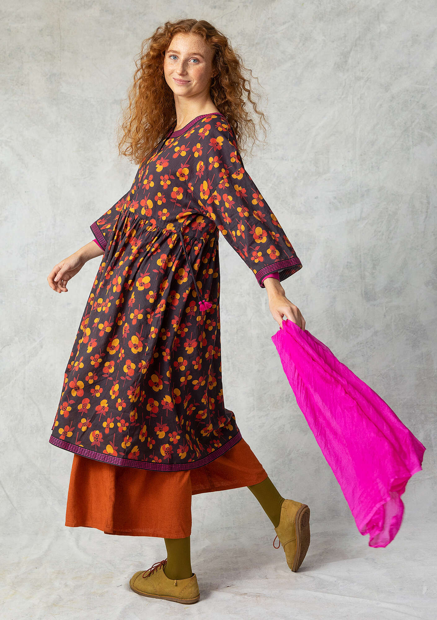 - Digitally printed dress in a fully buttoned style. Dropped shoulders and slightly shorter than three-quarter sleeves. Gathered seam at the waist for more volume in the skirt. Drawstring and double ties finished with small tassels in an accent color. Embroidery in an accent color at the neck, cuffs, hem and side pockets.Size and Measurement