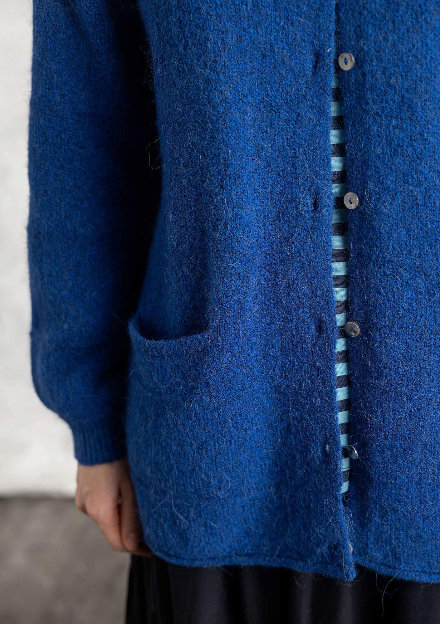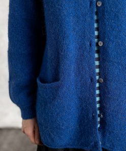 - Solid-colored cardigan with simple, textured-knit stripes. A-line and slightly longer style. Long, elegant puff sleeves with elastic cuffs. Mother-of-pearl buttons and pockets.Size and Measurement