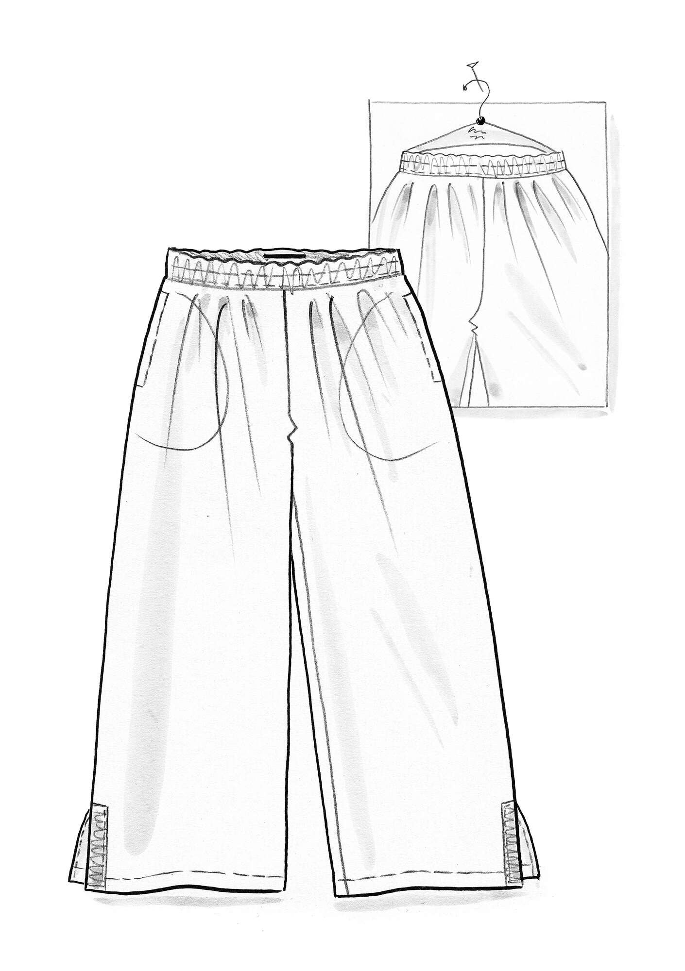 - Solid-colored jersey pants with a bit of width. Elastic waistband and side pockets. Slits with embroidered edges for a decorative detail.Size and Measurement
