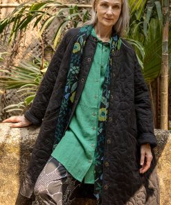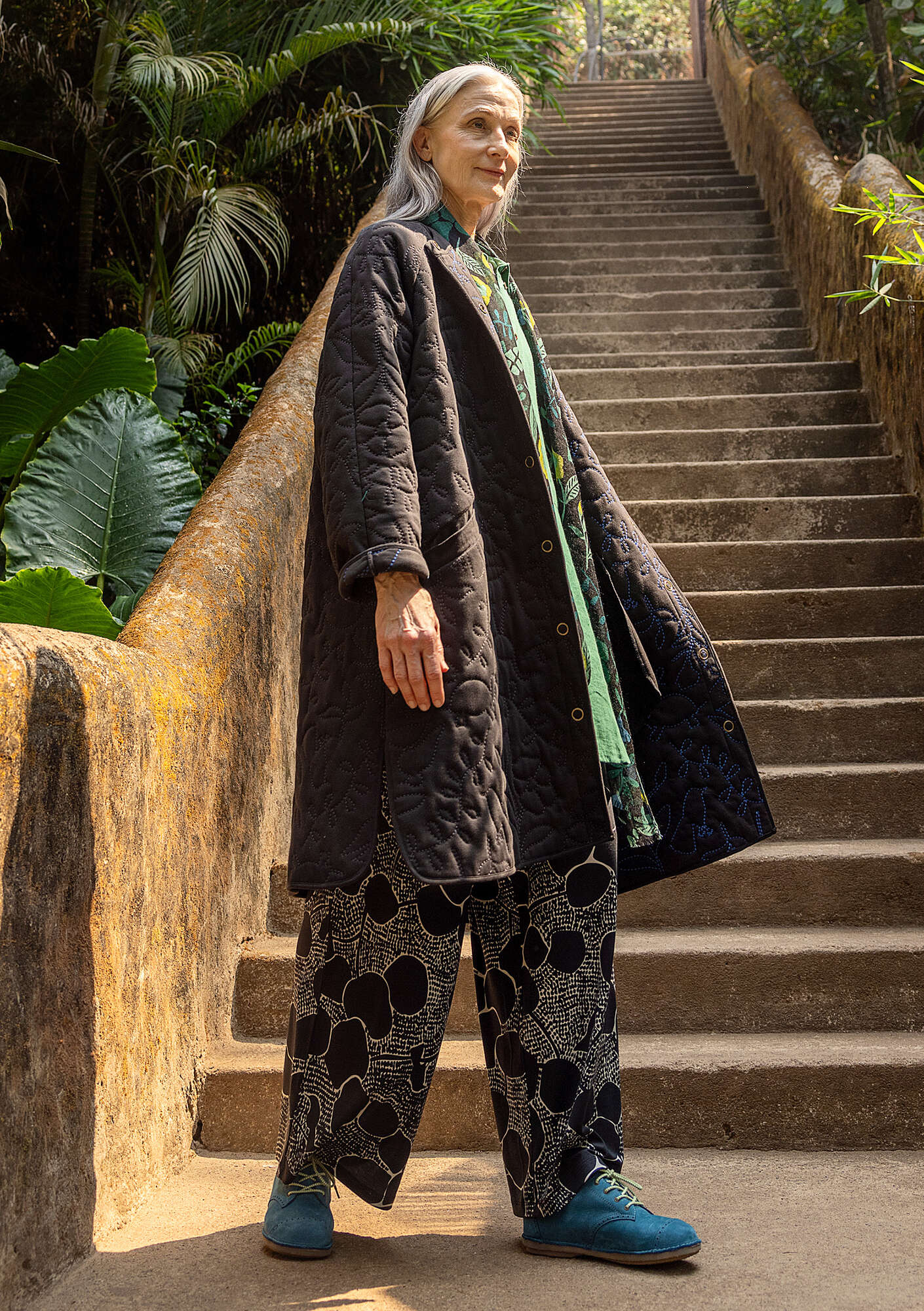 - 100% cotton. The cotton is certified organic. Filling in 100% polyester. The dyeing process is certified. Machine wash cold, delicate cycle. Stretch gently to length while damp. Do not tumble dry. Shrinkage 3-4%. Made in Delhi, India.