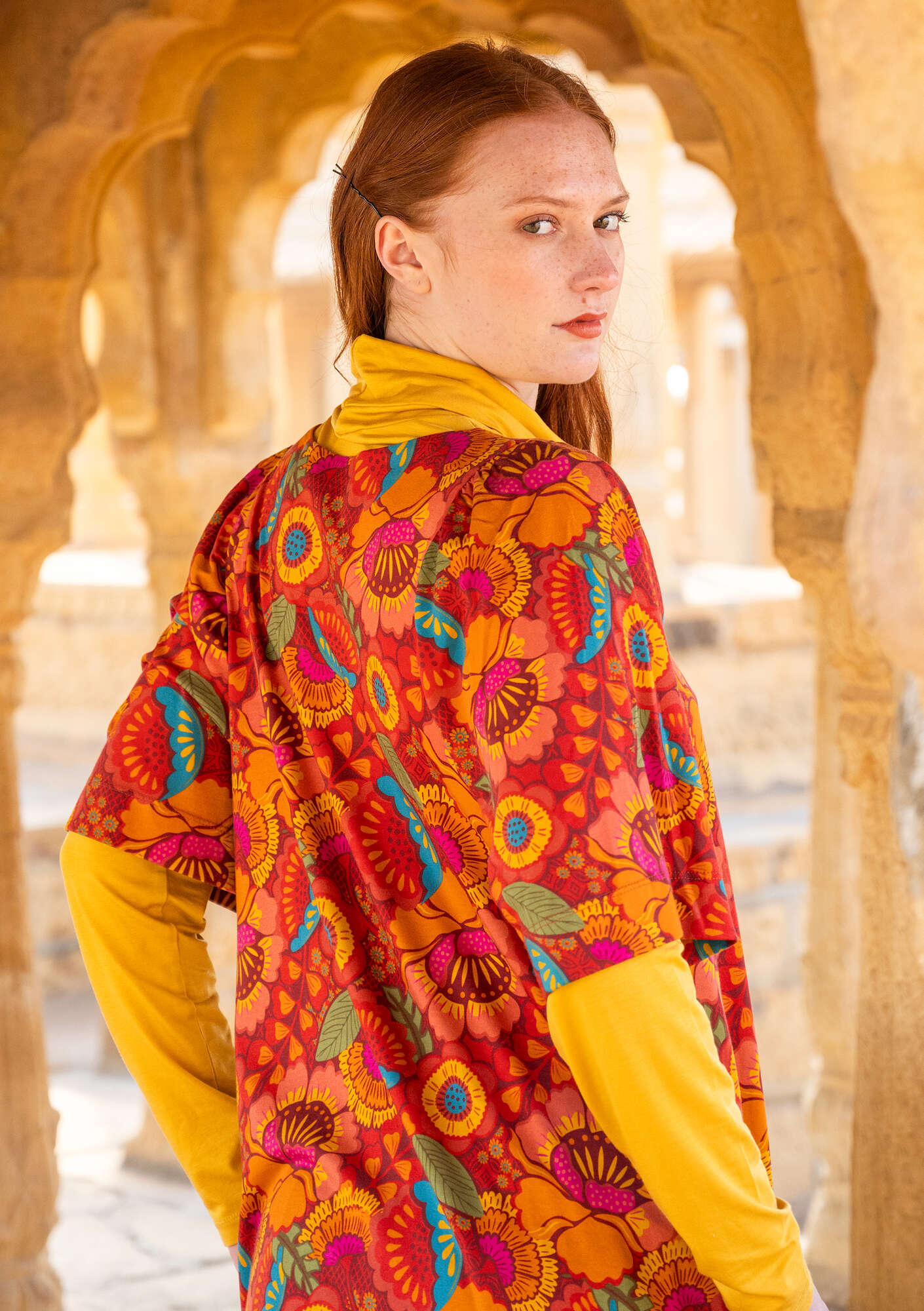 - 50% cotton/50% modal. The cotton is certified organic. TENCEL™ Modal fiber is made from certified forests and is produced by using renewable energy and by recycling the process chemicals. The fabric is digitally printed. The printing process is certified. Machine wash warm, delicate cycle. Stretch gently to length while damp. Do not tumble dry. Shrinkage 3-4%. Made in Volos, Greece.