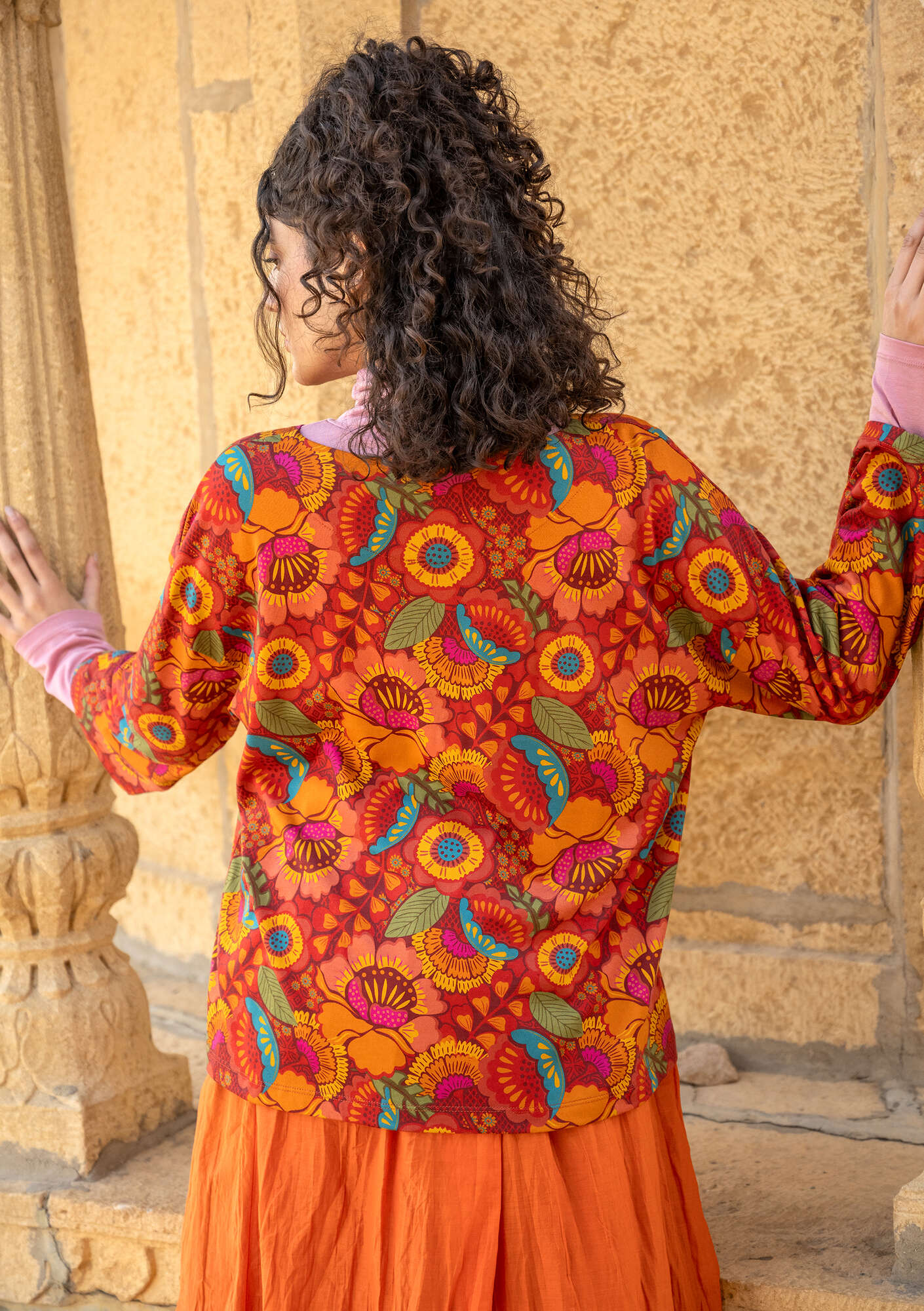 - Digitally printed jersey top patterned with big, beautiful flowers. Boxy style with a subtle boat neck and long sleeves.Size and Measurement