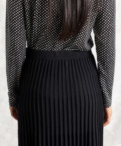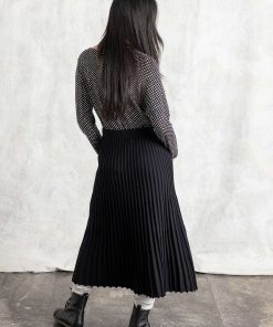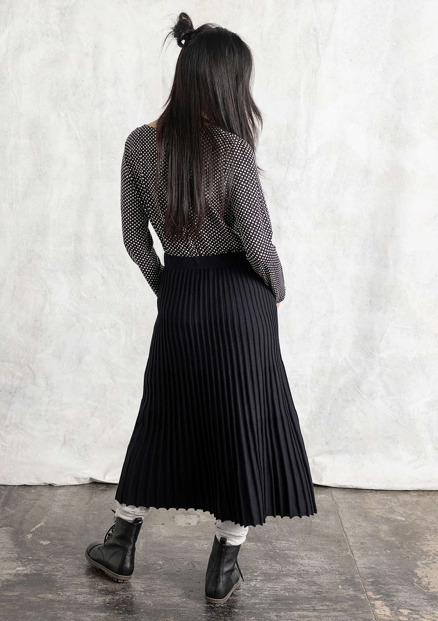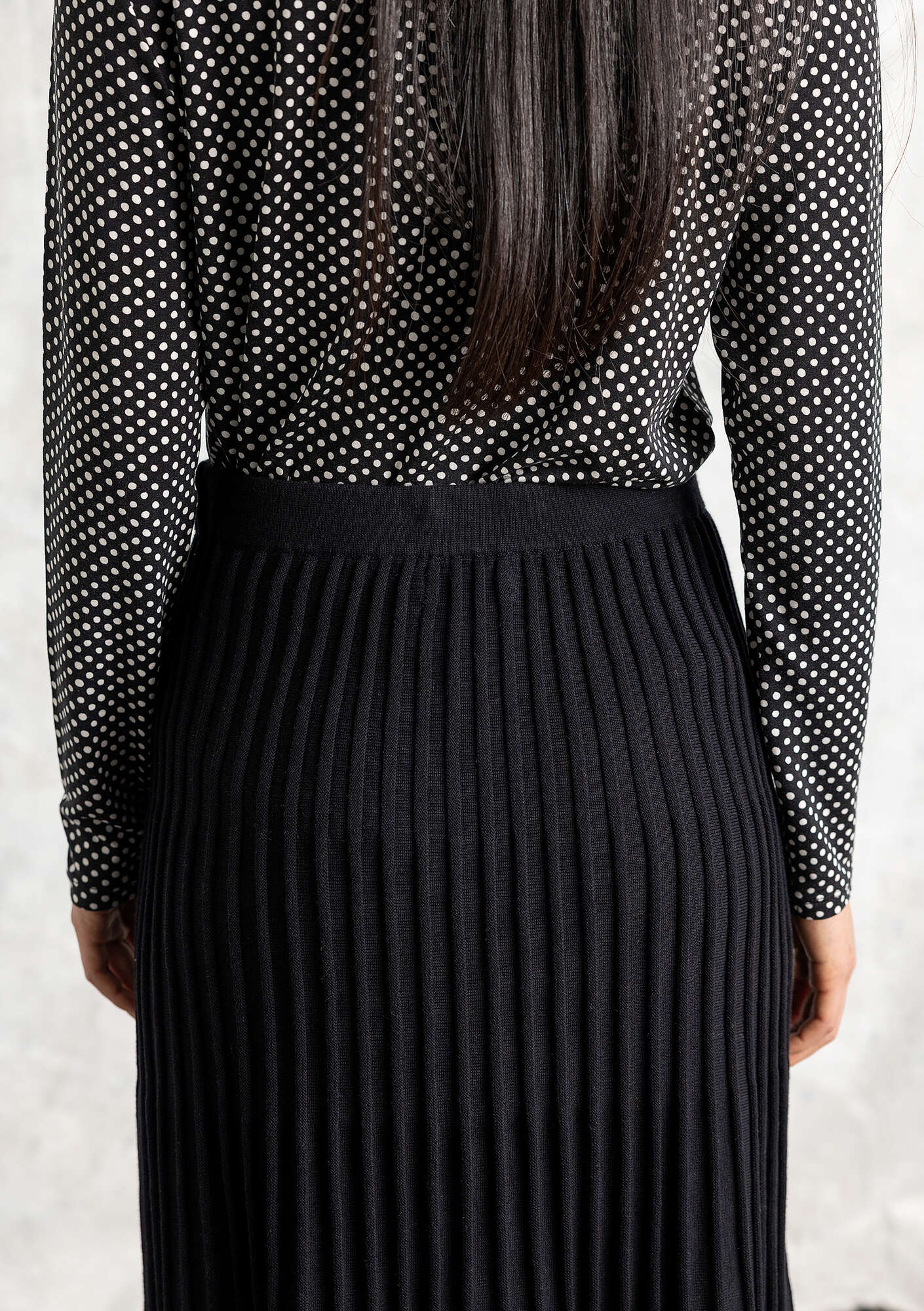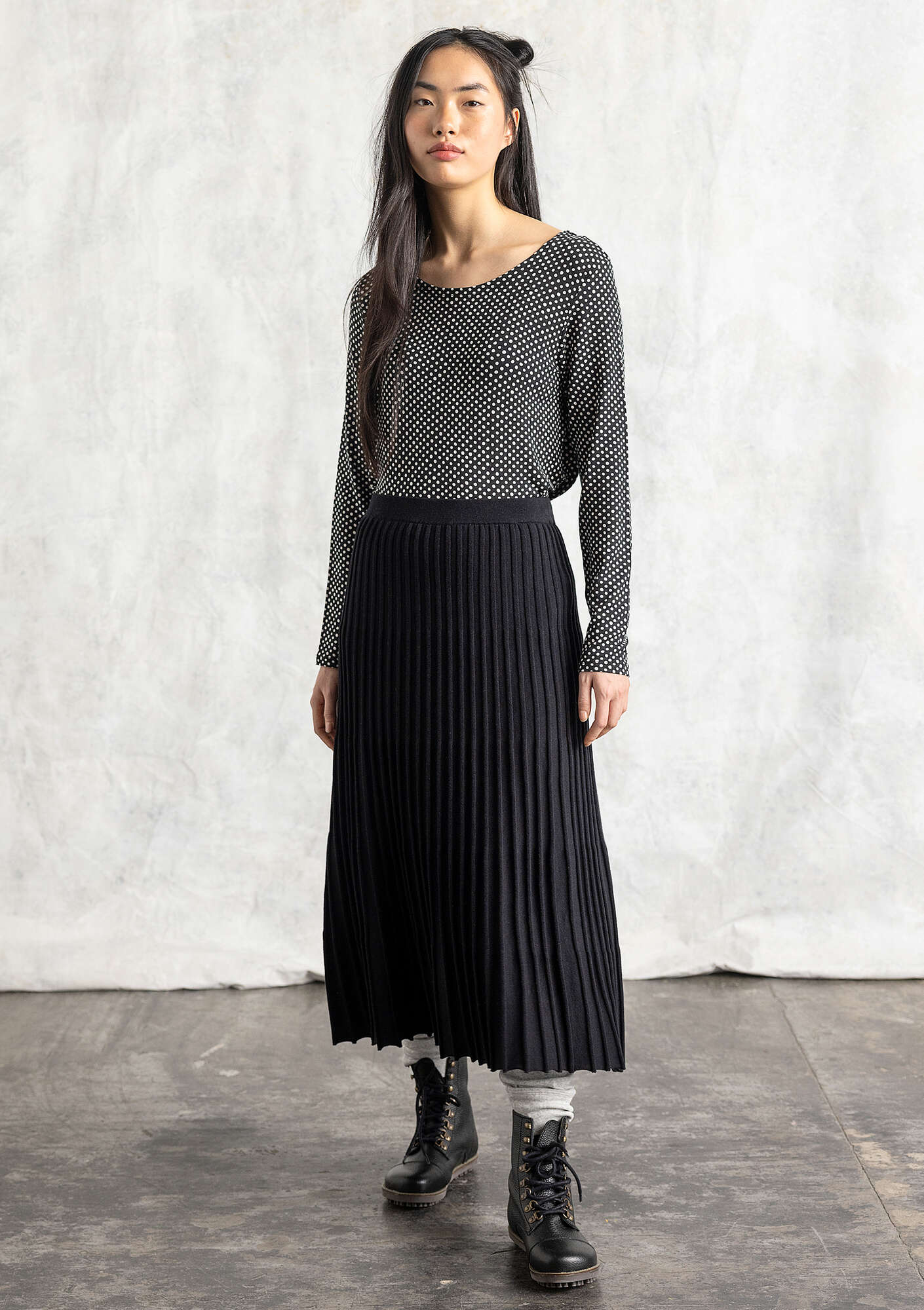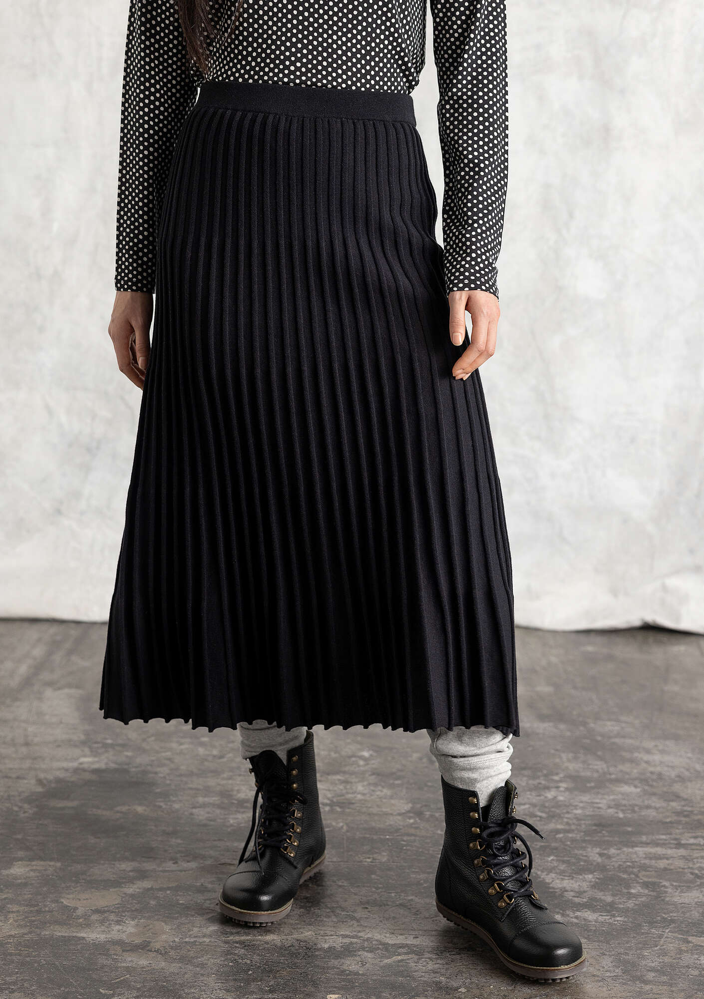 - Pleated skirt with a touch of volume at the hem. The knit skirt is available solid-colored and striped with an accent color. Smooth waistband with comfortable elastic.Size and Measurement