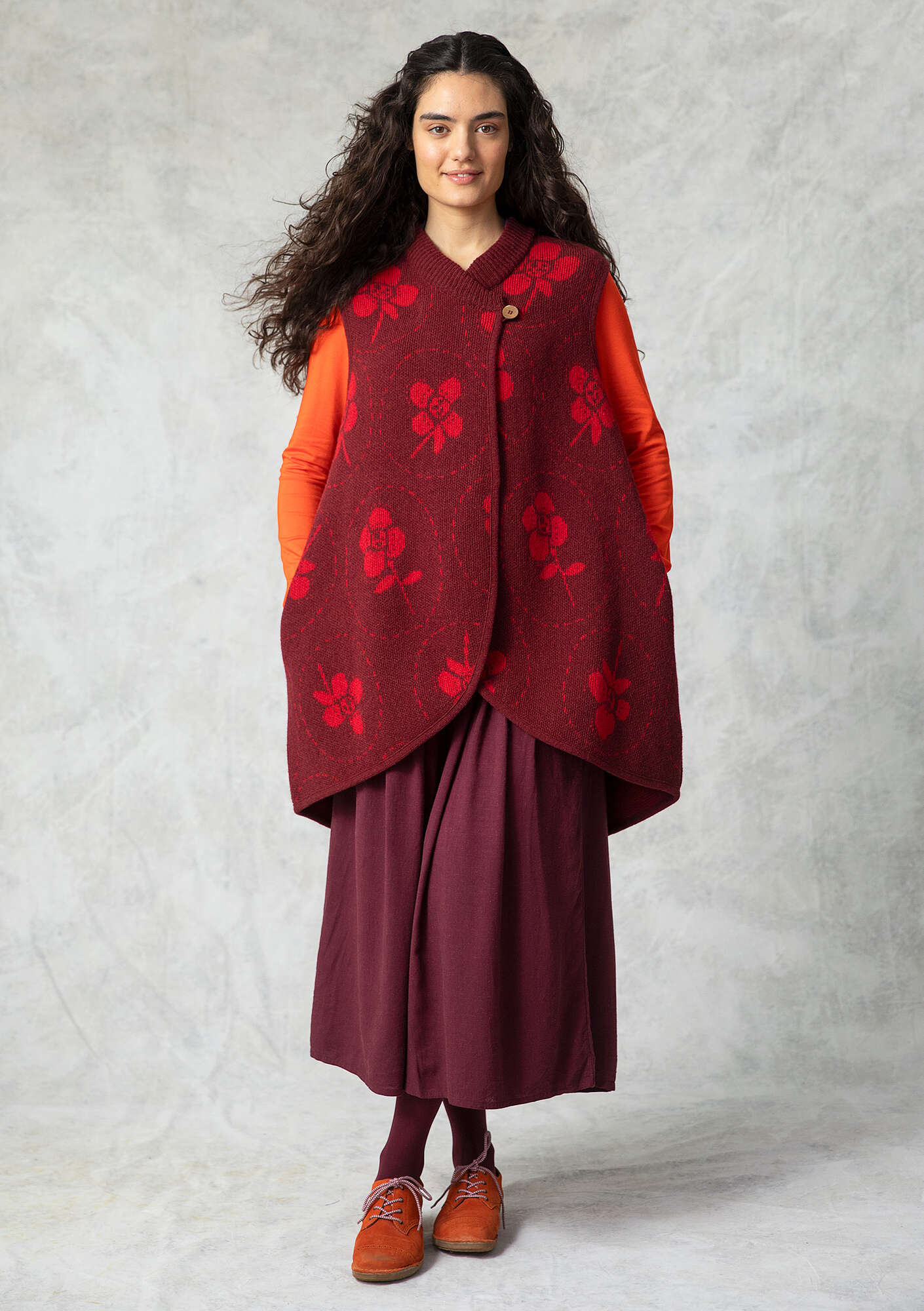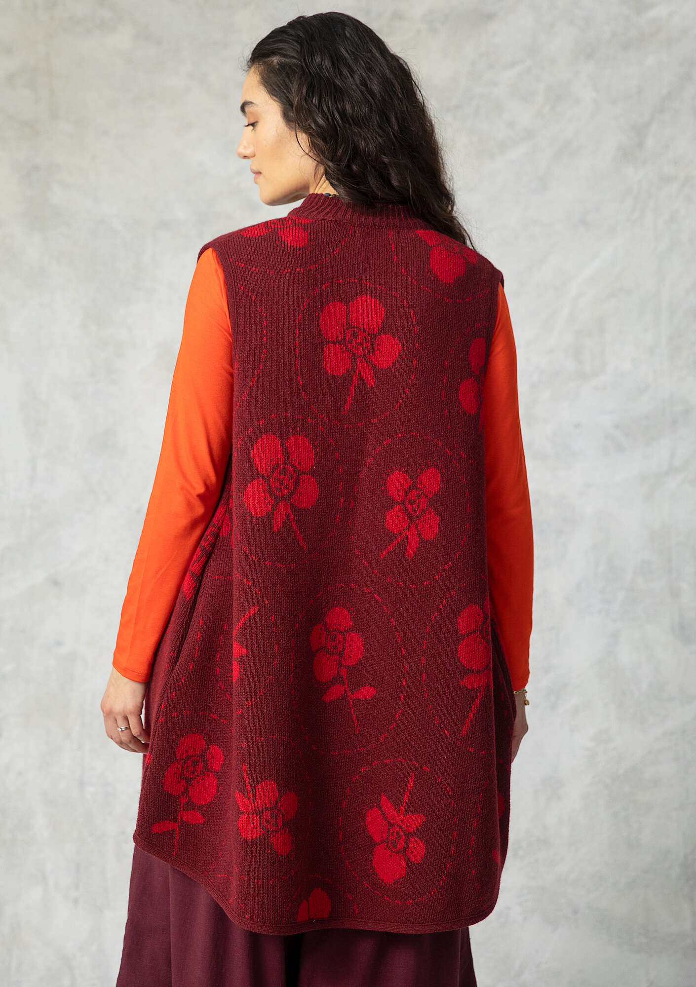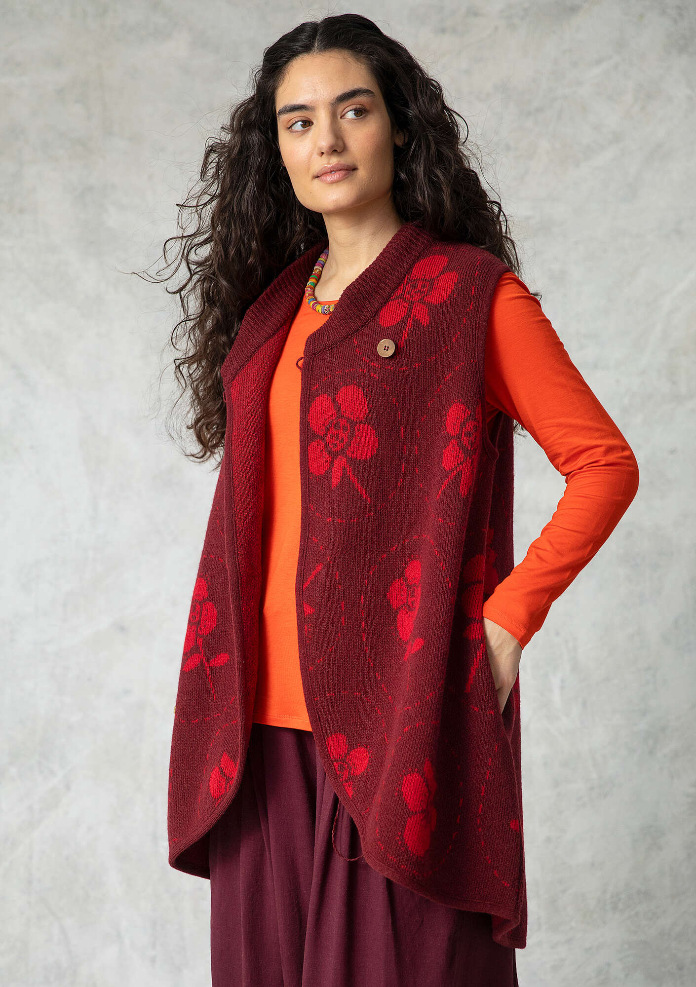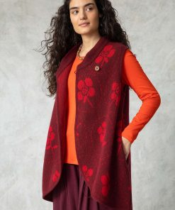 - Jacquard-knit long vest with a rib-knit collar. Knit band along the edge and side pockets. Slightly overlapping style with a coconut wood button on both the outside and inside of the garment.Size and Measurement