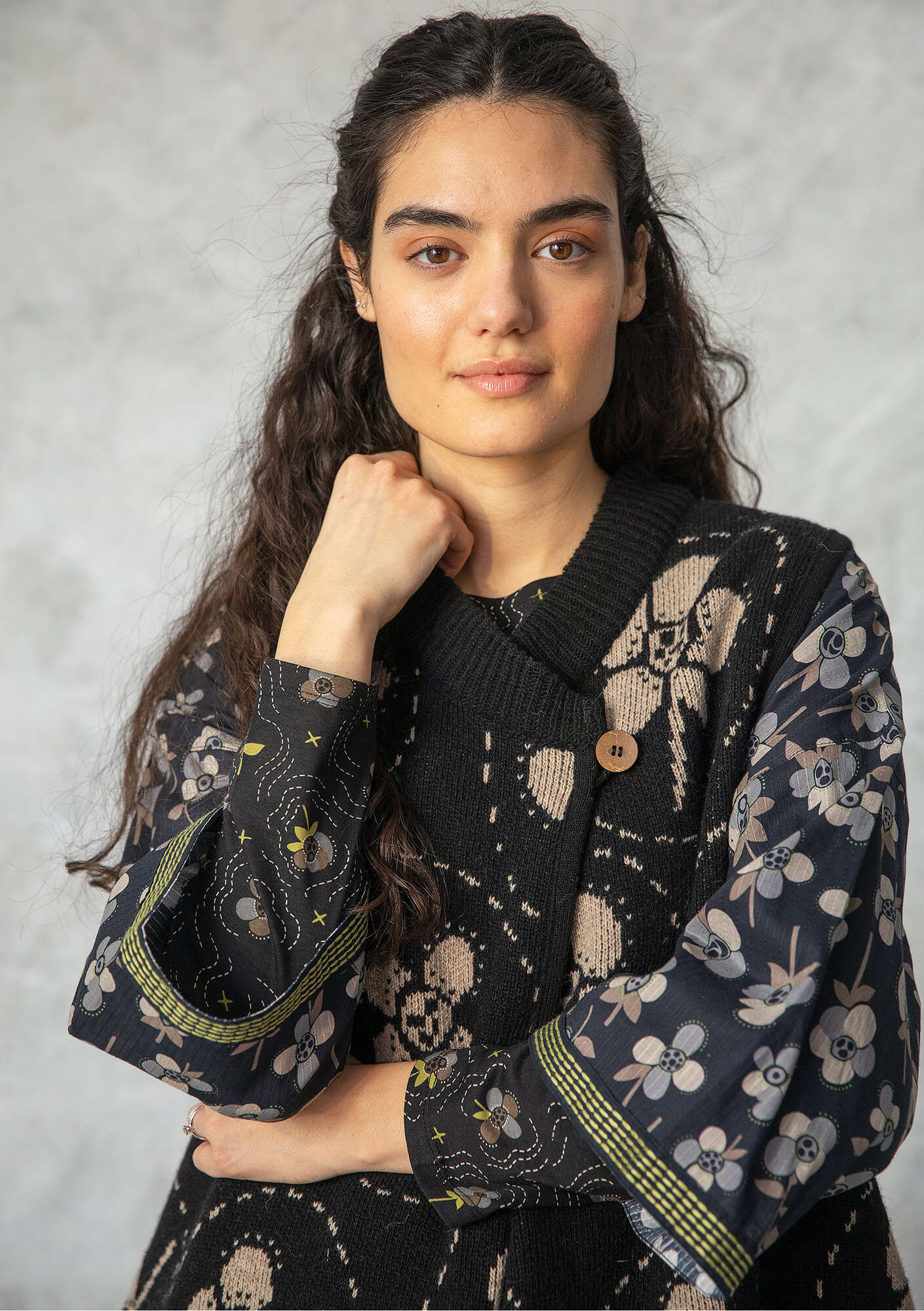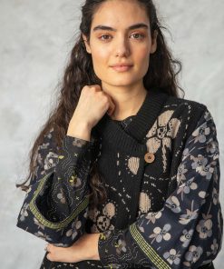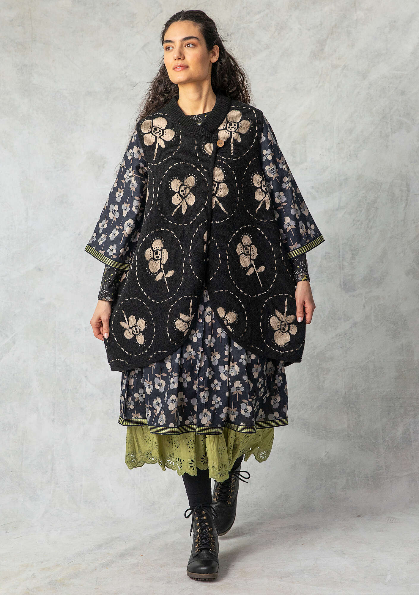 - Jacquard-knit long vest with a rib-knit collar. Knit band along the edge and side pockets. Slightly overlapping style with a coconut wood button on both the outside and inside of the garment.Size and Measurement