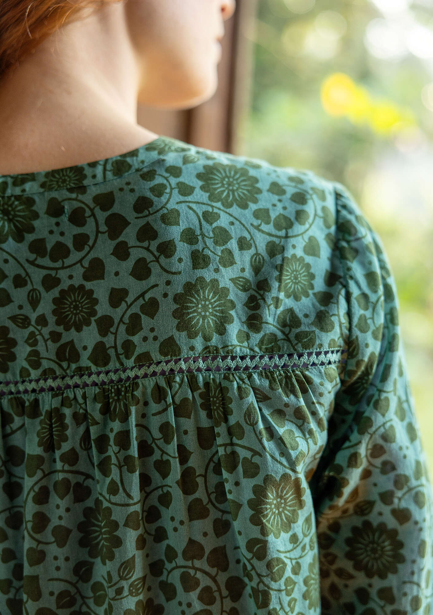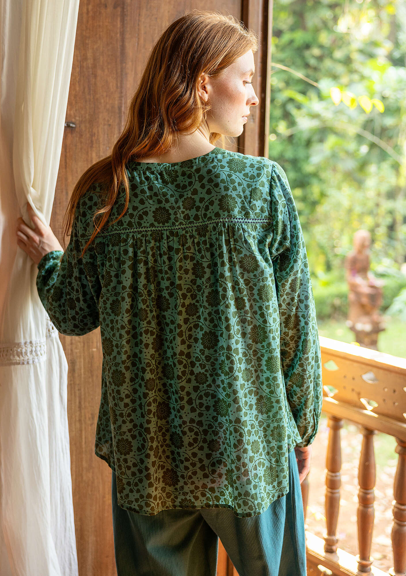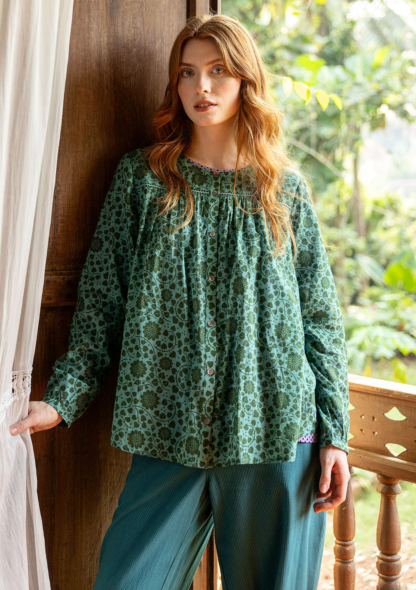 - Printed blouse in a fully buttoned style with a yoke at the front and back, and an inset crocheted band. Band collar and cuffs with trim and a button. Mother-of-pearl buttons.Size and Measurement