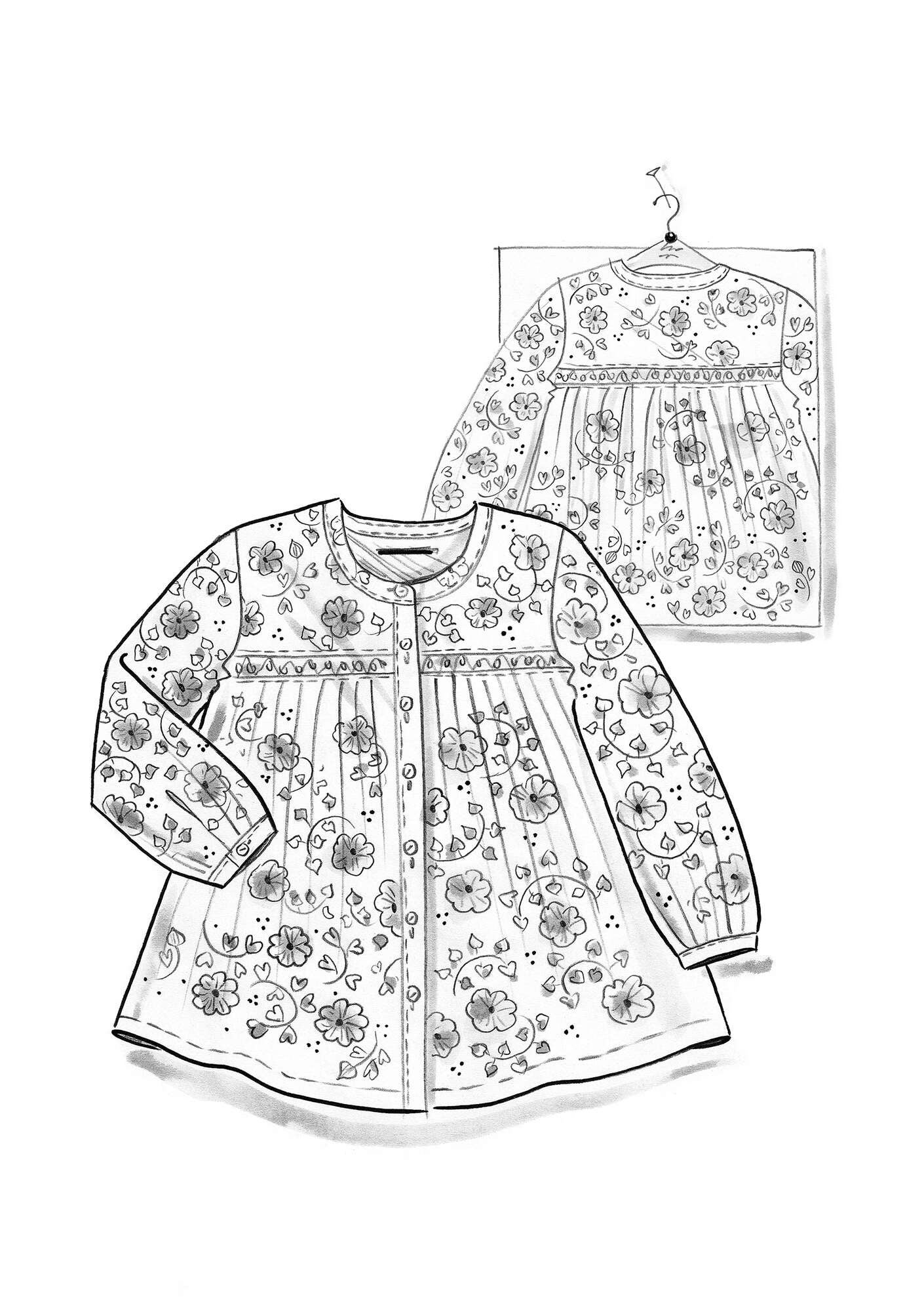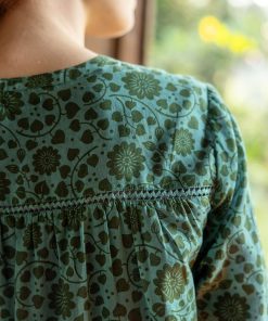 - 100% cotton. The cotton is certified organic. The entire production chain is certified. Digitally printed. Machine wash warm, delicate cycle. Medium iron. Shrinkage 2-3%. Made in Delhi, India.