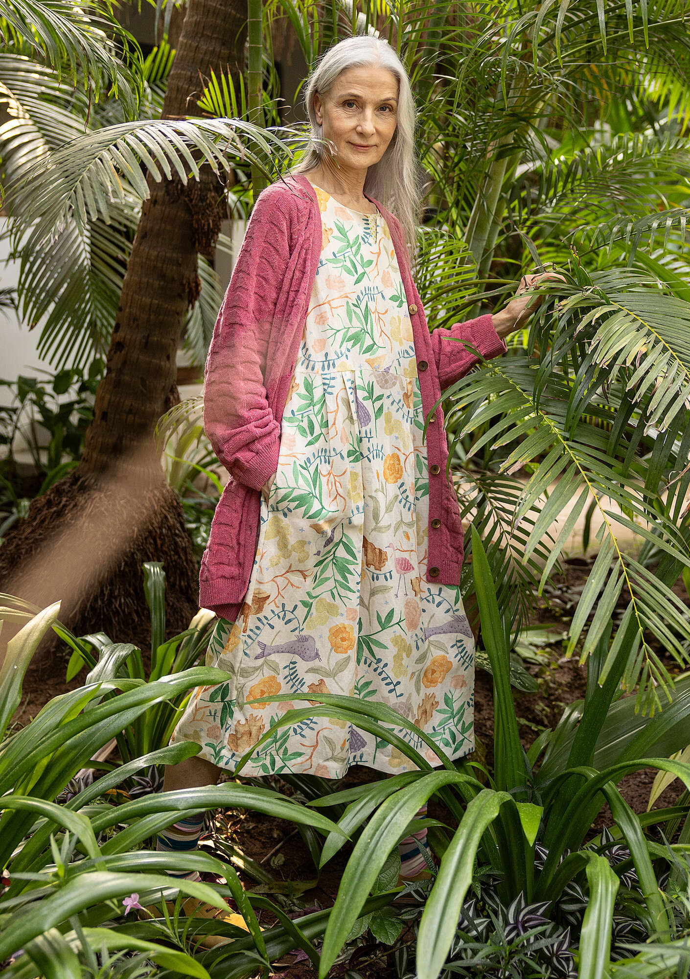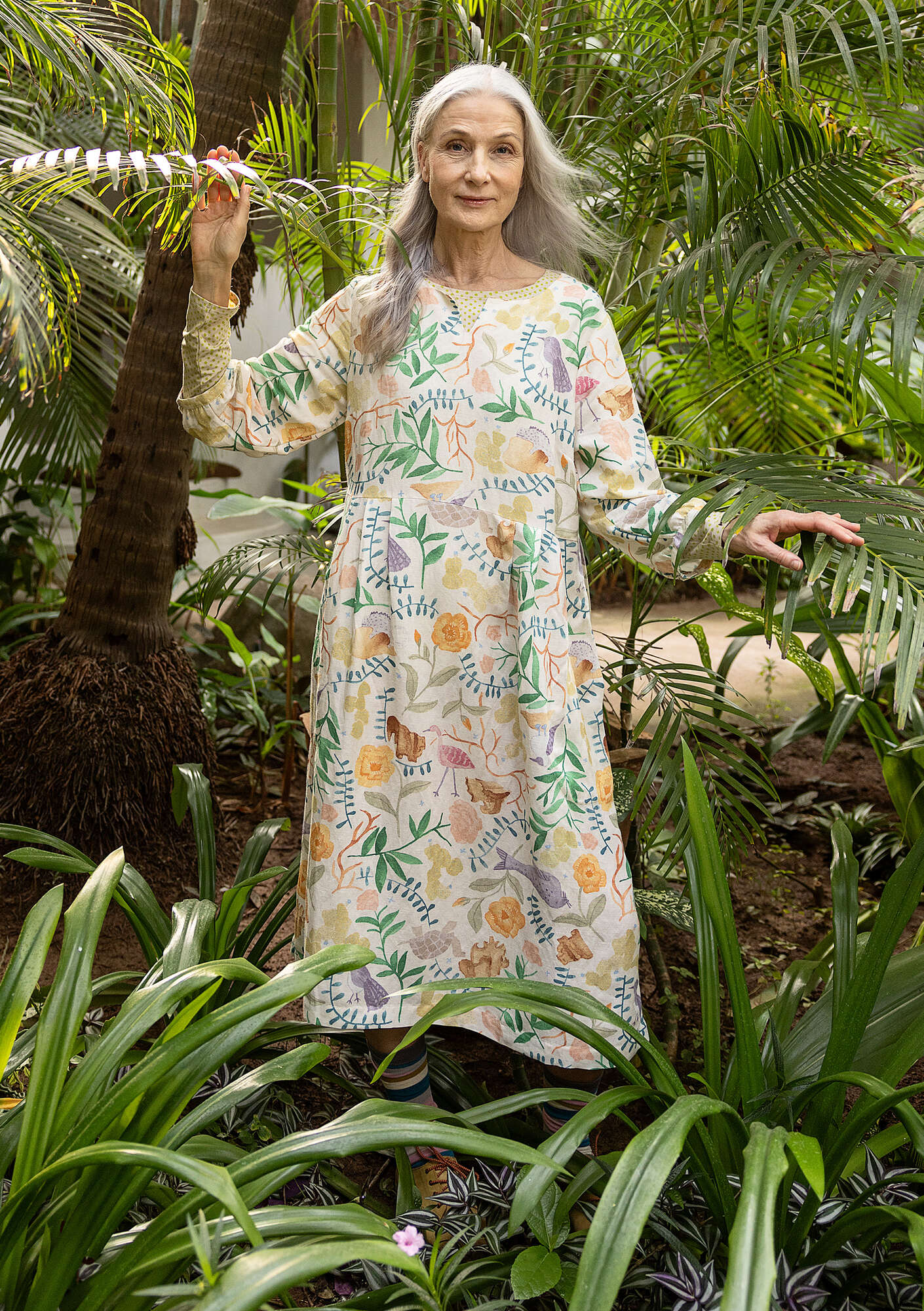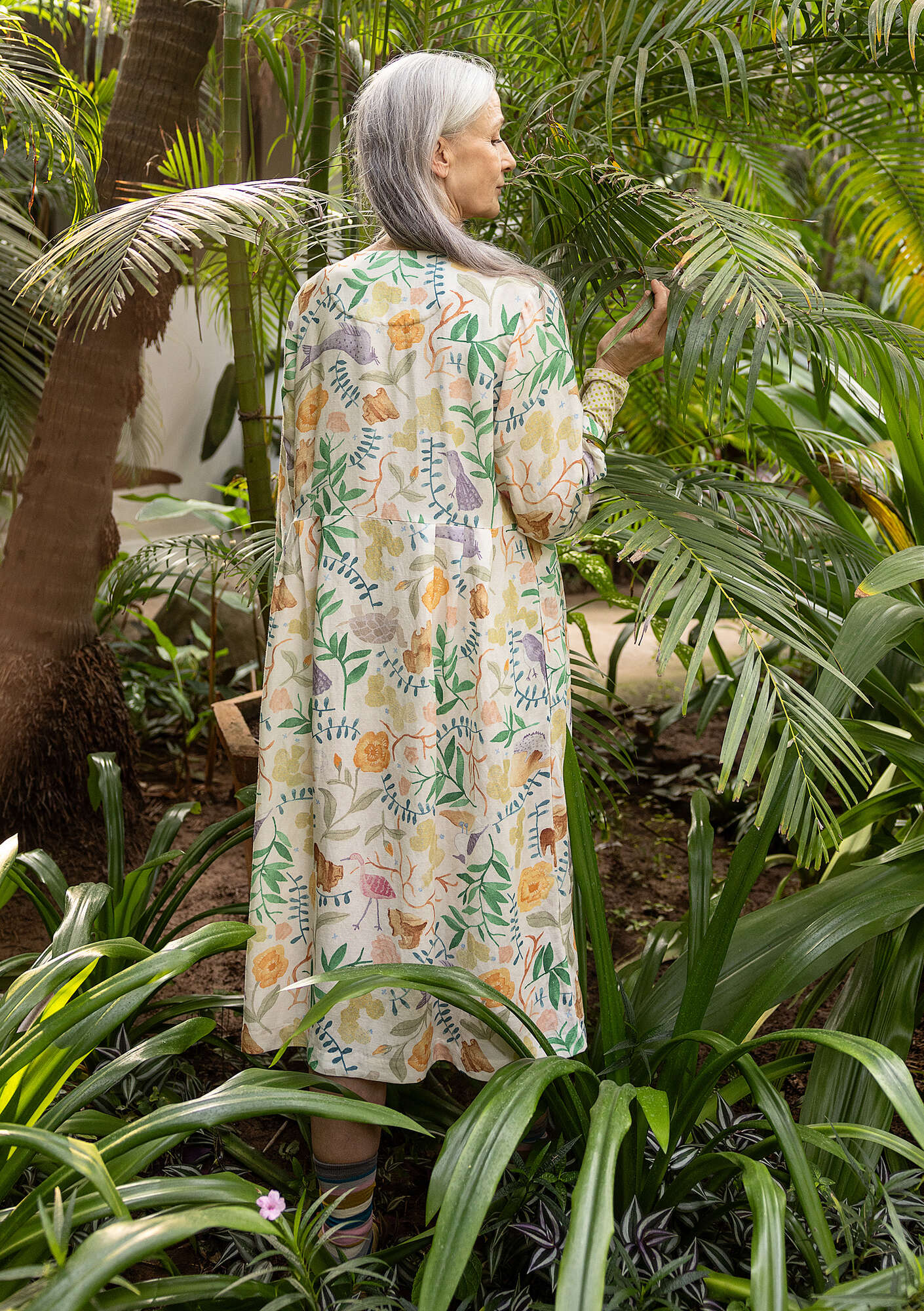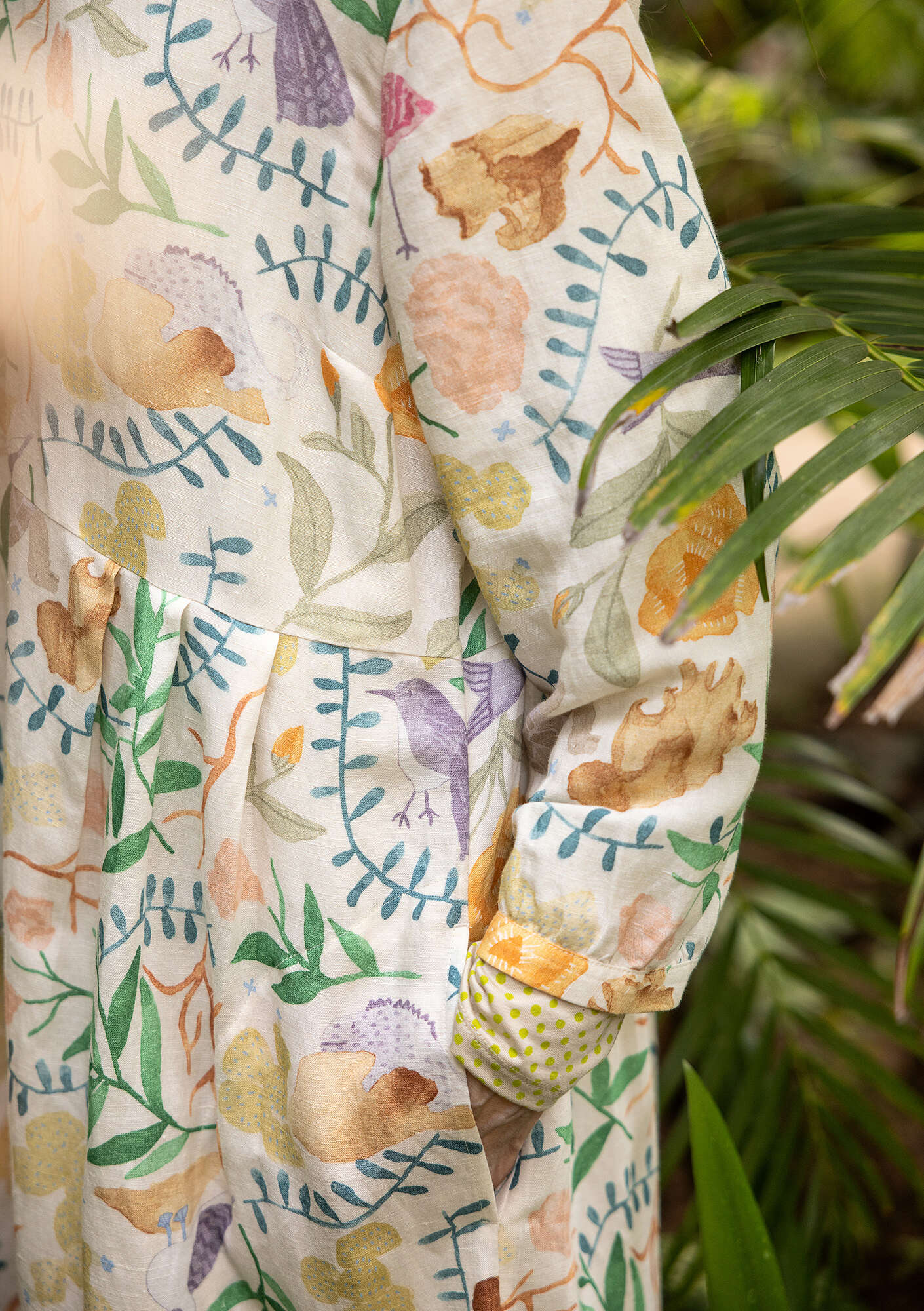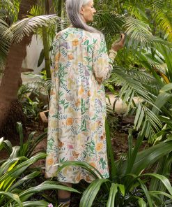 - 55% linen/45% modal. The linen is dew-retted, a natural process in which the sun and dew handle the work without chemicals and with minimal water use. The modal is Livaeco™ Modal. This garment is digitally printed. The entire production chain is certified. Machine wash warm, delicate cycle. Medium iron. Shrinkage 2-3%. Made in Delhi, India.