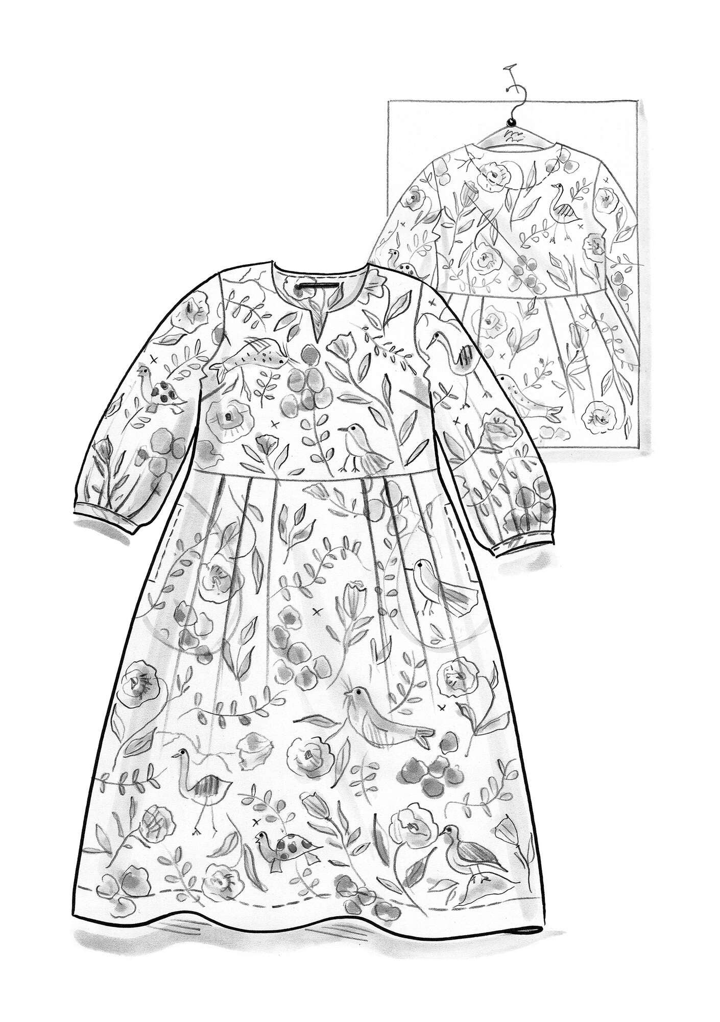 - Digitally printed dress in a pattern design with a watercolor feel. Style with a seam at the waist and pleats. Round neckline with a small vent and three-quarter sleeves with a puff of volume. Comfy side pockets.Size and Measurement