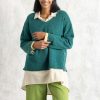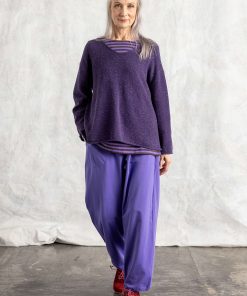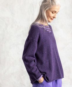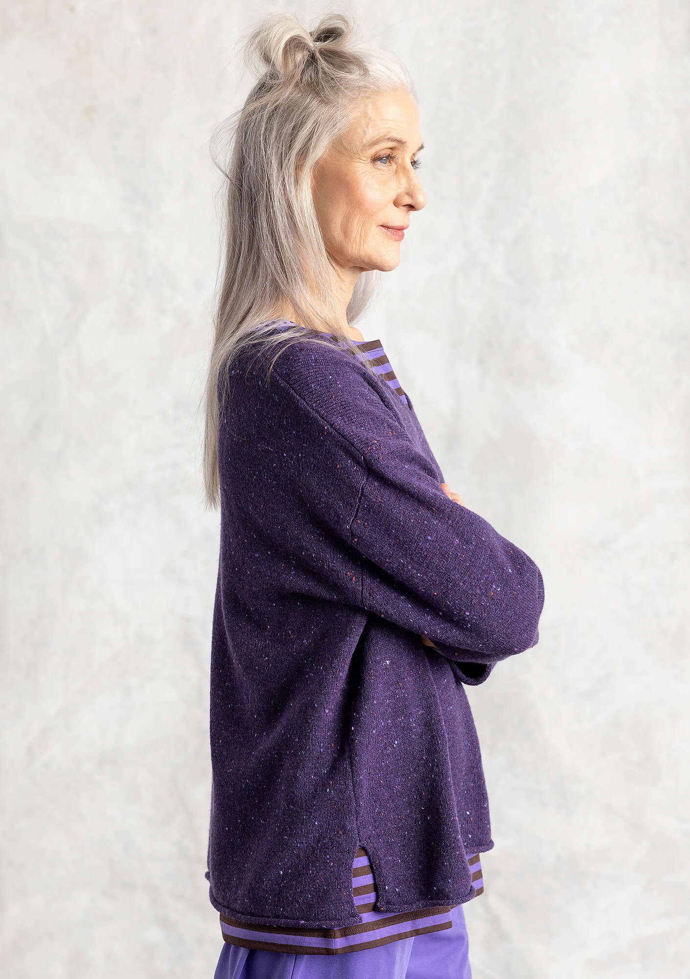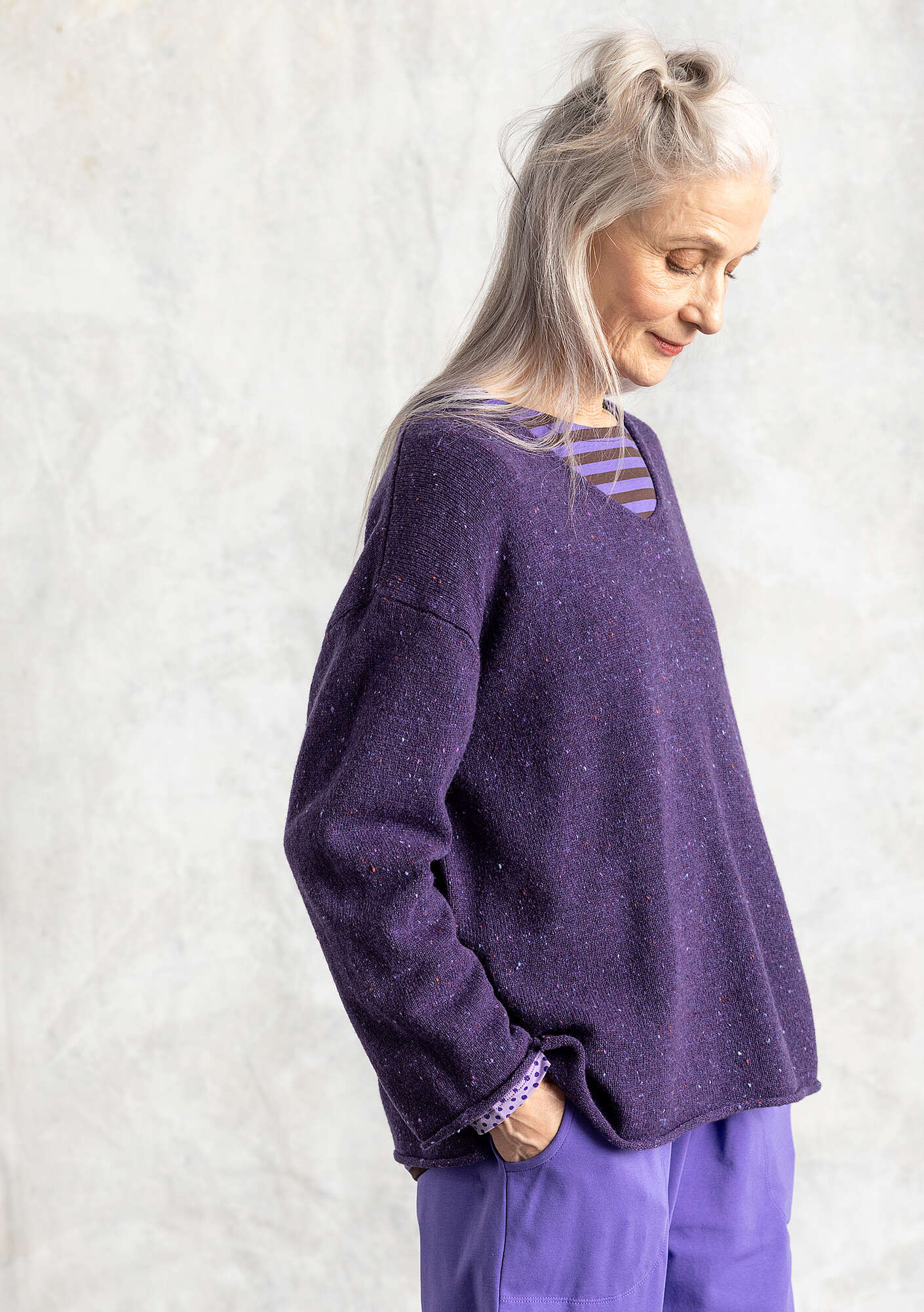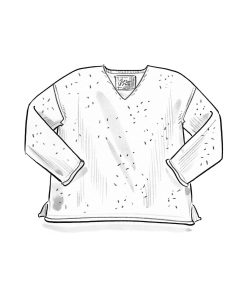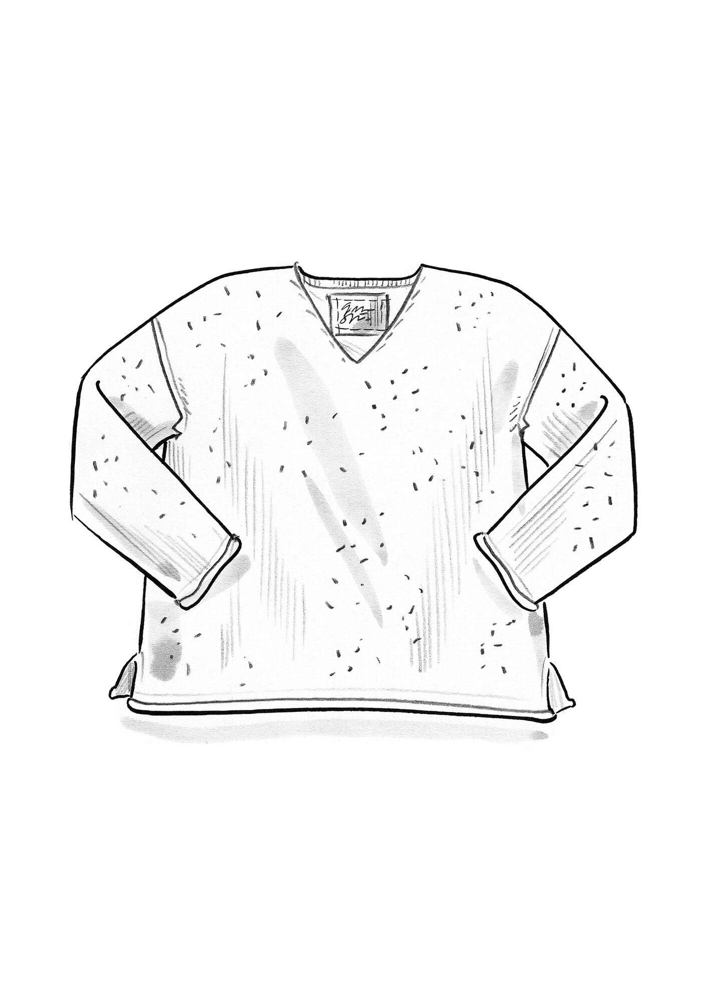 - V-neck sweater in a slightly looser style. Knit in our nubby house-designed variegated yarn. The cuffs and hem are finished with a little rolled edge. Small slits at sides.Size and Measurement
