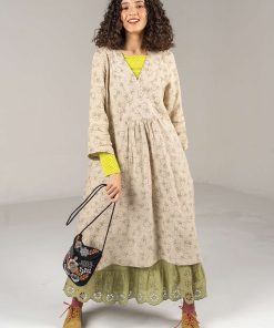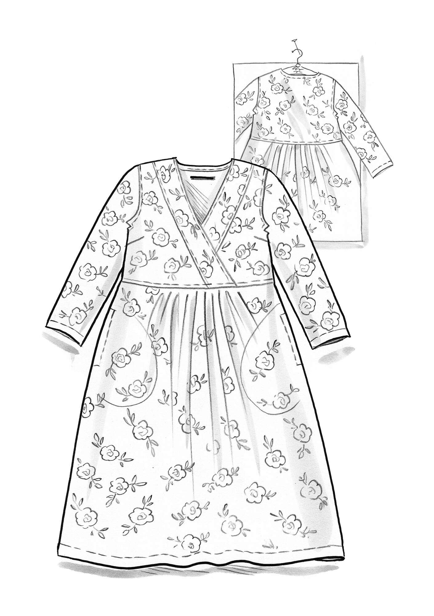 - V-neck style with a sewn overlap detail at the front. Three-quarter sleeves. Gathers at the center of the front and back provide a little extra width at the hem. Available printed and in yarn-dyed stripes. Side pockets.Size and Measurement