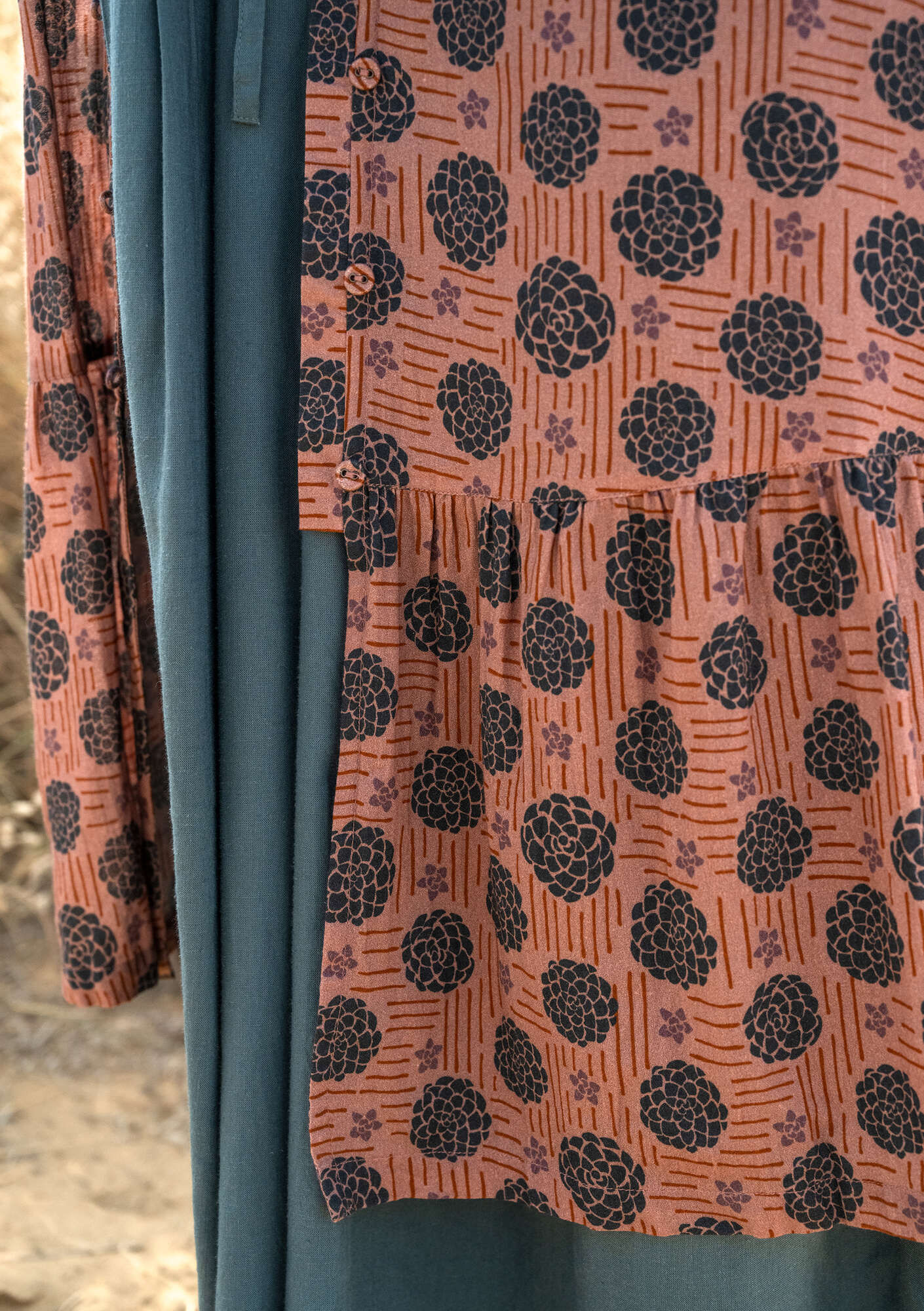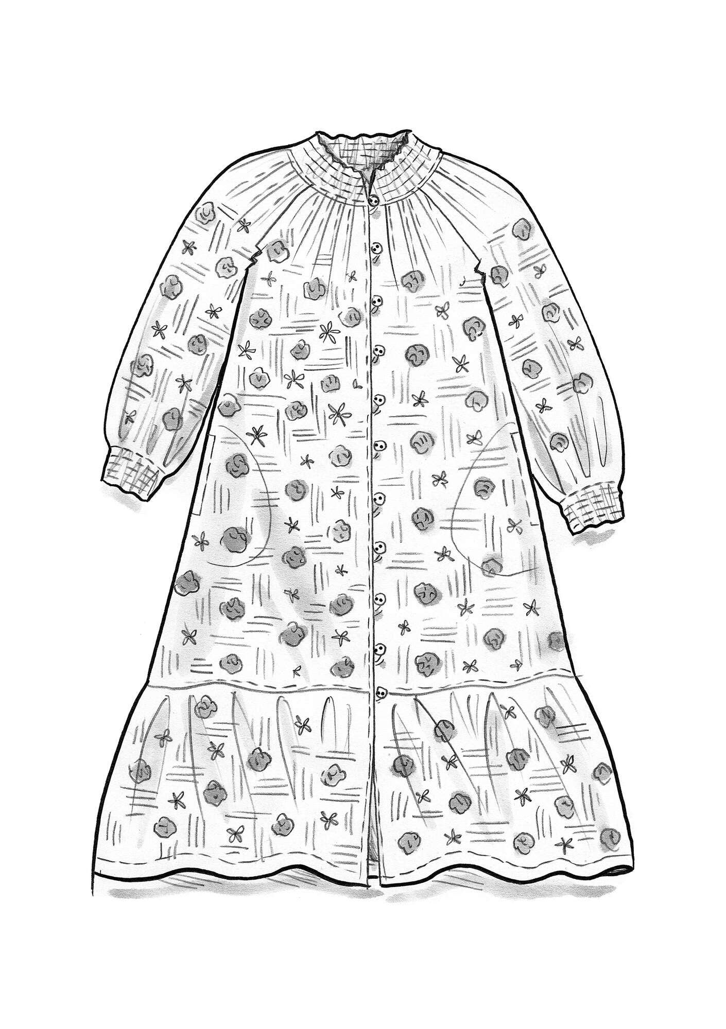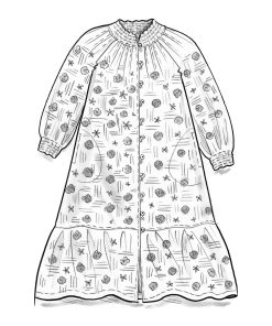 - Printed dress with a ruffle along the hem. Round neckline with smocking. Fully buttoned, covered buttons and side pockets. Raglan sleeves, slightly longer than three-quarter length, with smocked cuffs.Size and Measurement