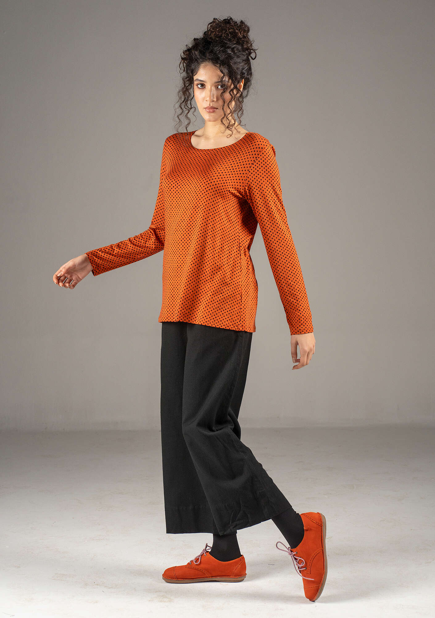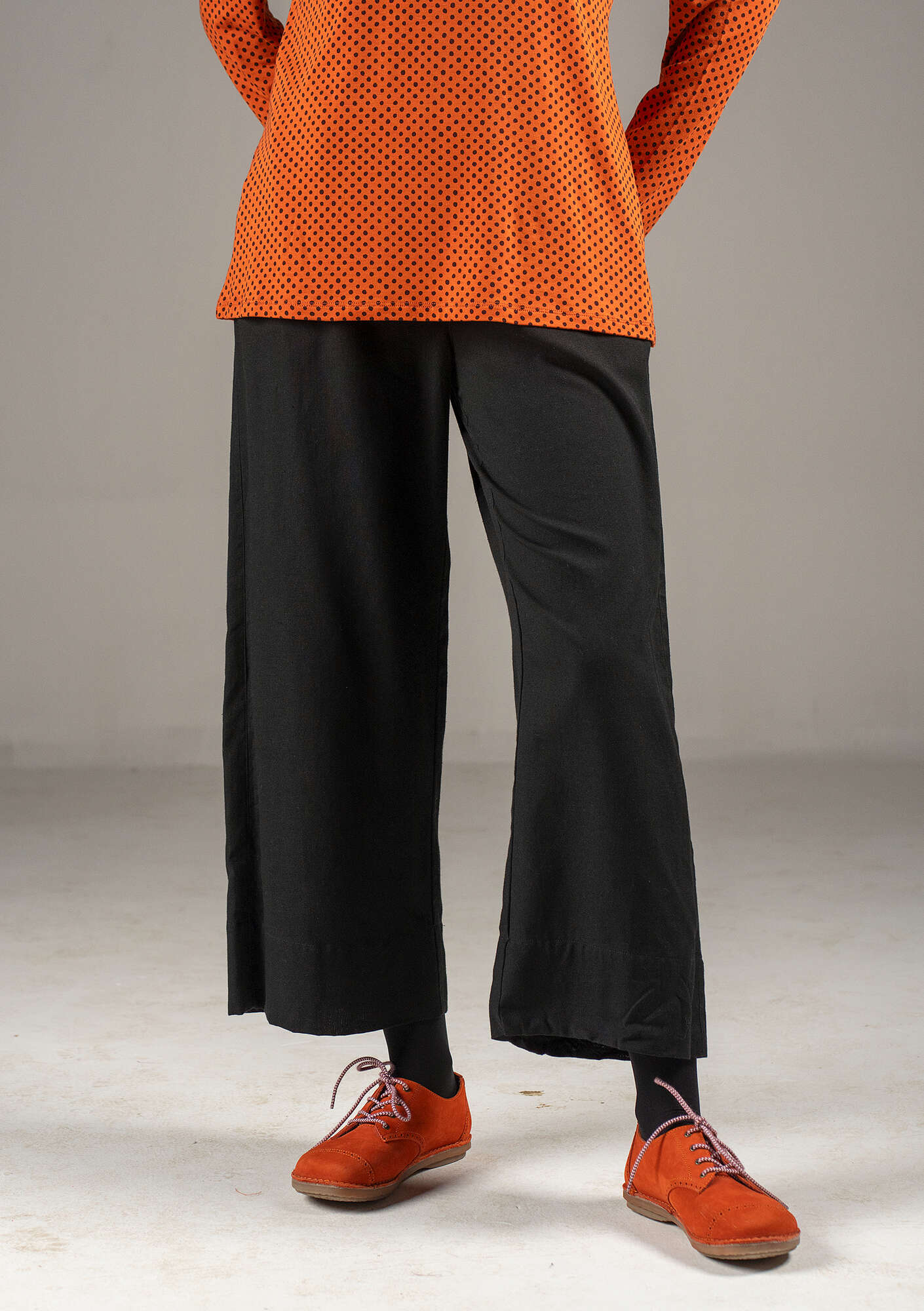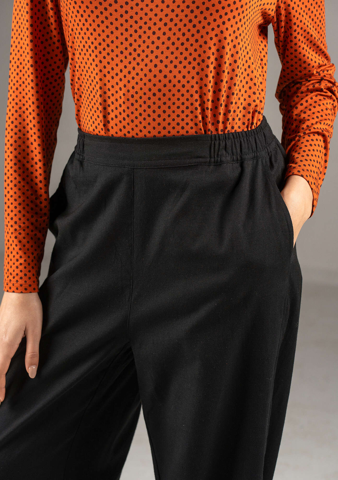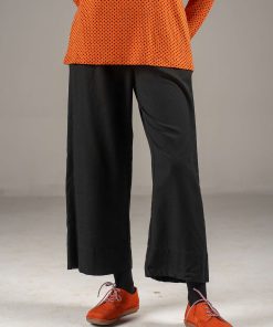 - Ankle-length style with wide hems. Practical pockets. Comfortable elastic waist with a smooth section at the front center. In this soft fabric, the seed hulls are left in the yarn as a lovely detail.Size and Measurement