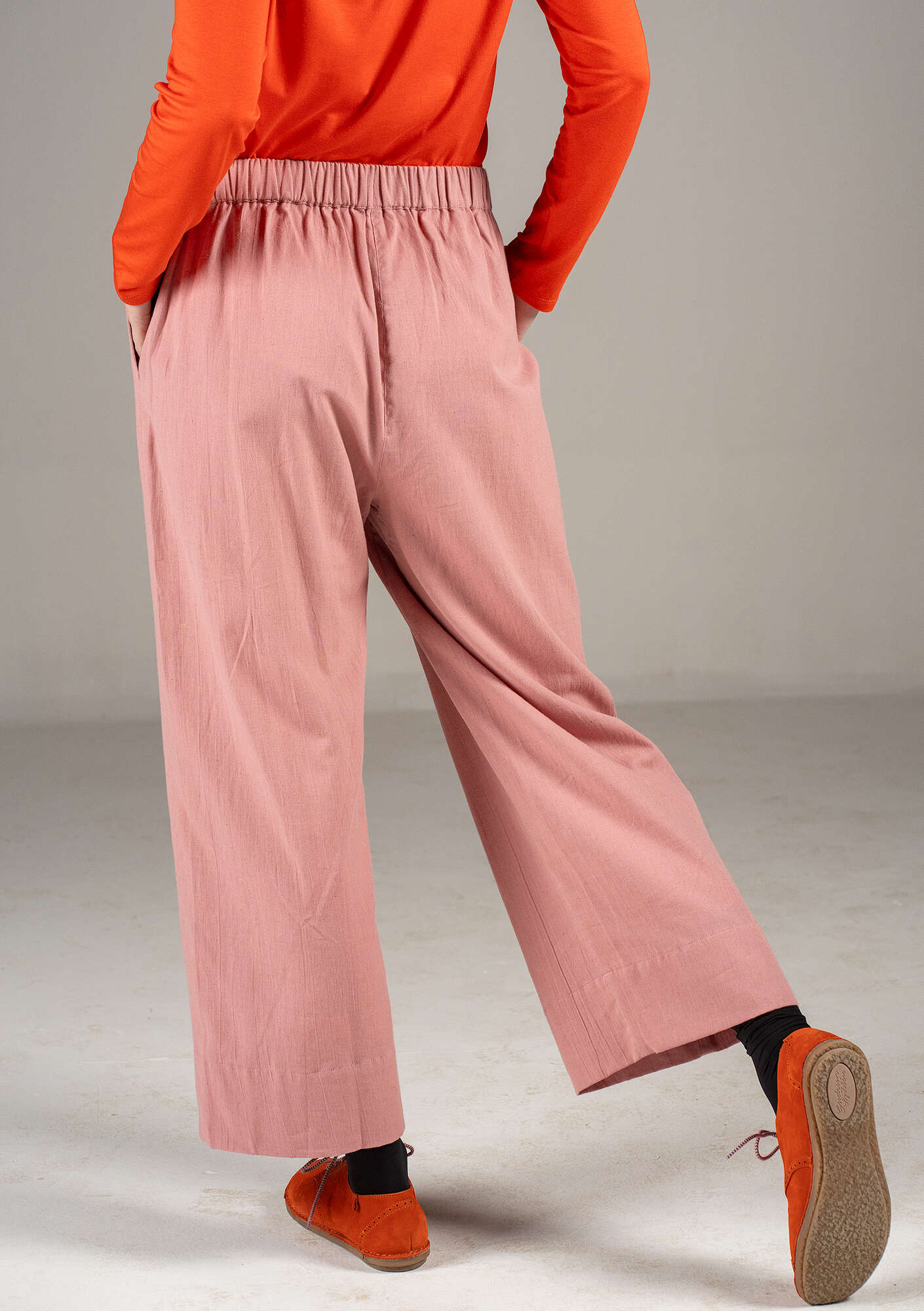 - Ankle-length style with wide hems. Practical pockets. Comfortable elastic waist with a smooth section at the front center. In this soft fabric, the seed hulls are left in the yarn as a lovely detail.Size and Measurement