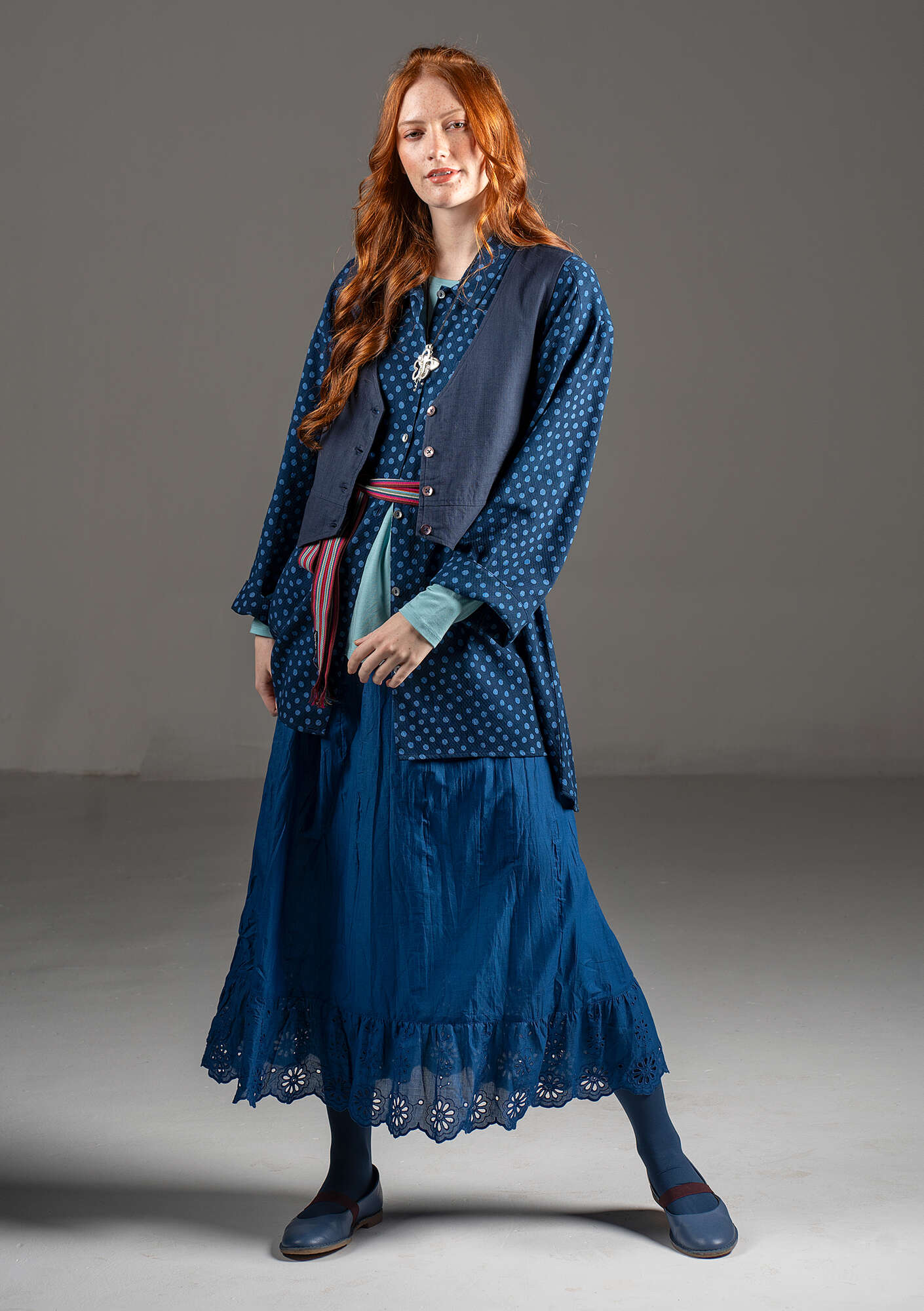 - 100% cotton. The cotton is certified organic. The entire production chain is certified. Machine wash warm, delicate cycle. Medium iron. Shrinkage 2-3%. Made in Noida, India.