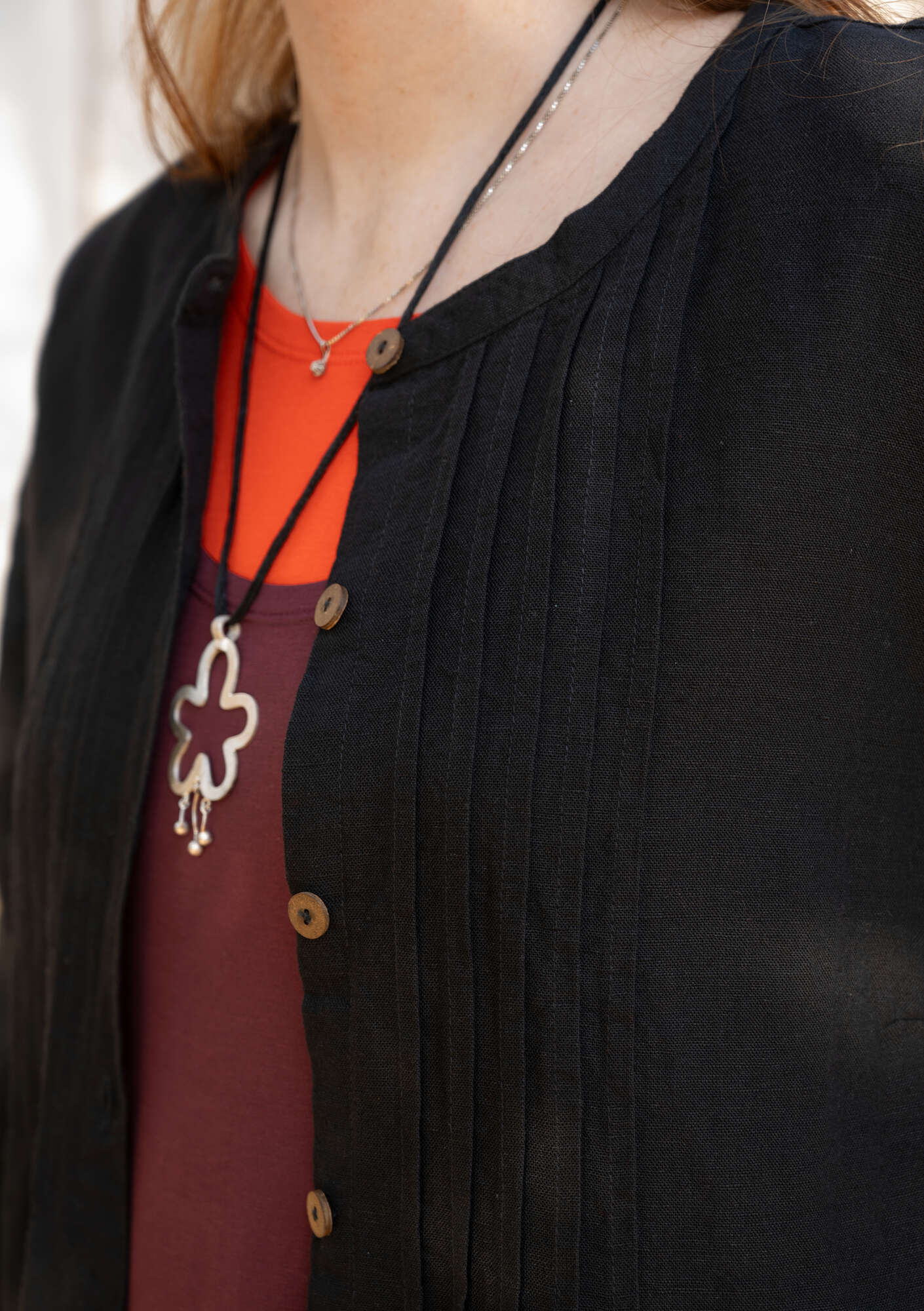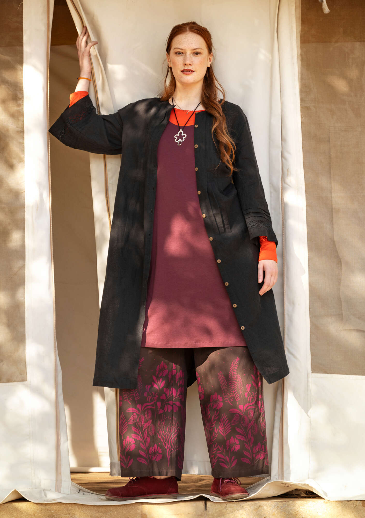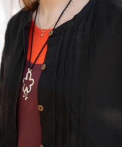 - 55% cotton, 45% linen. The cotton is certified organic. The linen is dew-retted, a natural process in which the sun and dew handle the work without chemicals and with minimal water use. The entire production chain is certified. Machine wash cold, delicate cycle. Medium iron. Shrinkage 2-3%. Made in Mumbai, India.