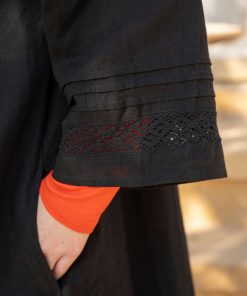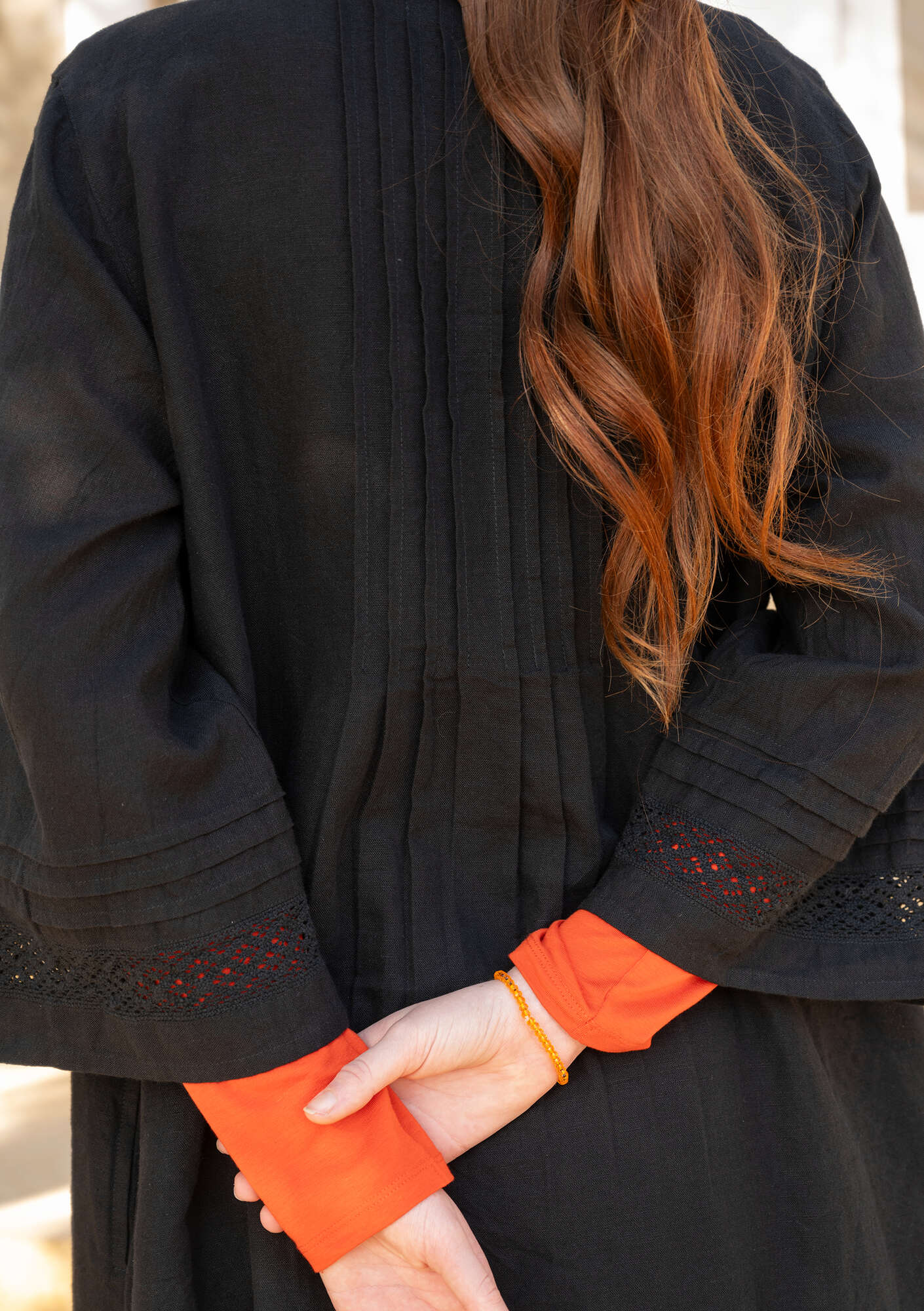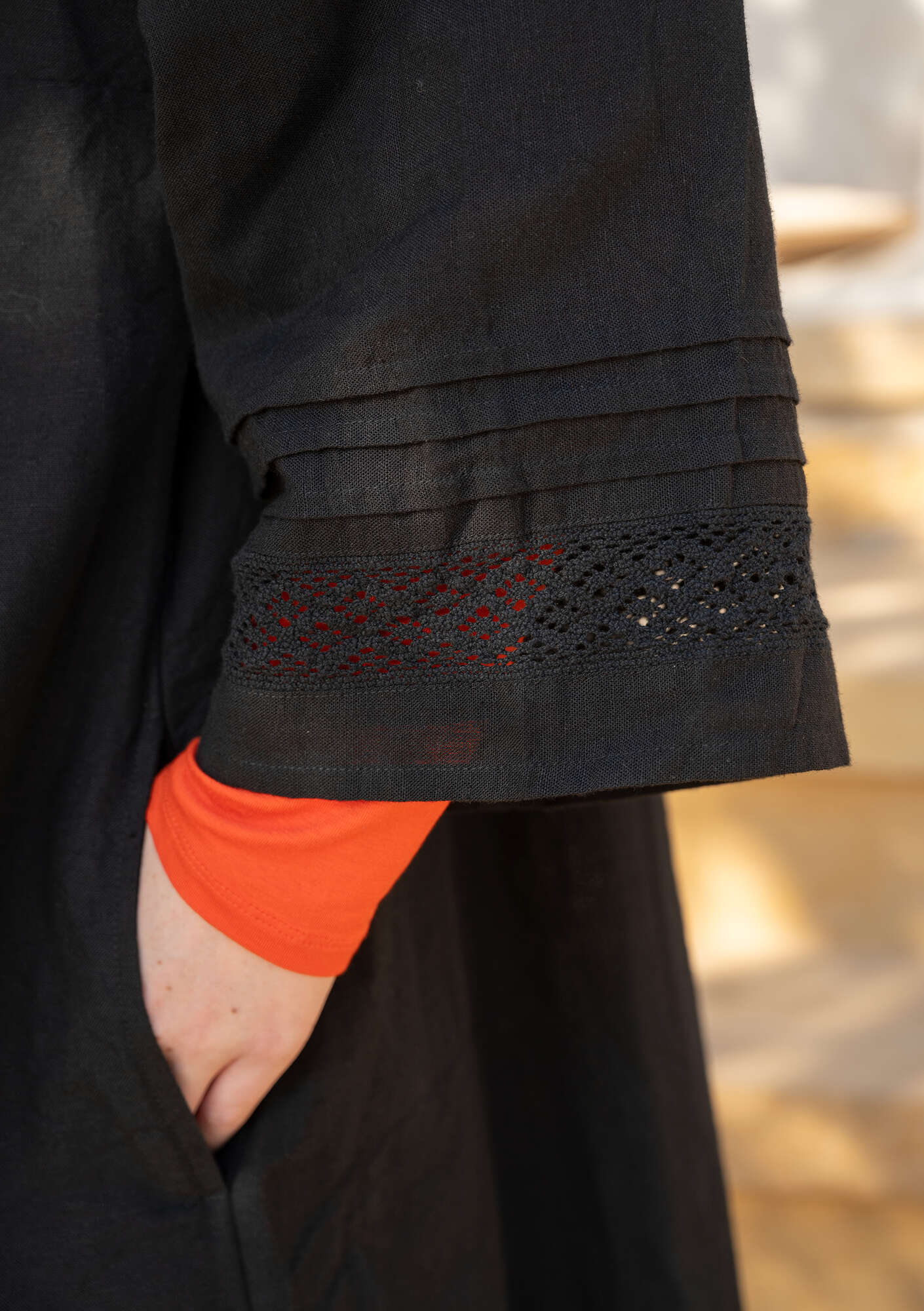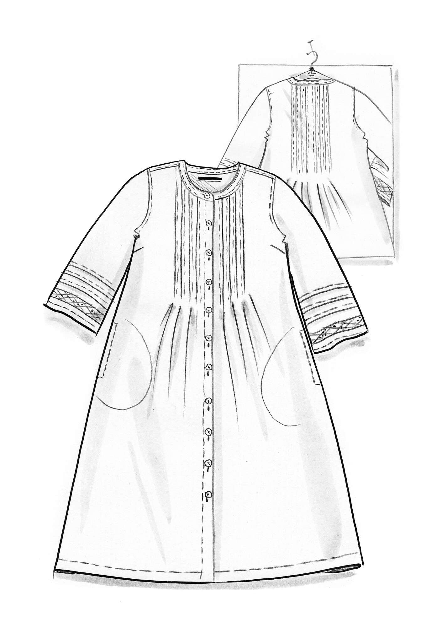 - Solid-colored dress in a beautiful linen blend. Pintucks at the top on the front and back, giving the garment plenty of volume toward the hem. Side pockets and three-quarter sleeves with inset lace. Natural-colored coconut buttons.Size and Measurement