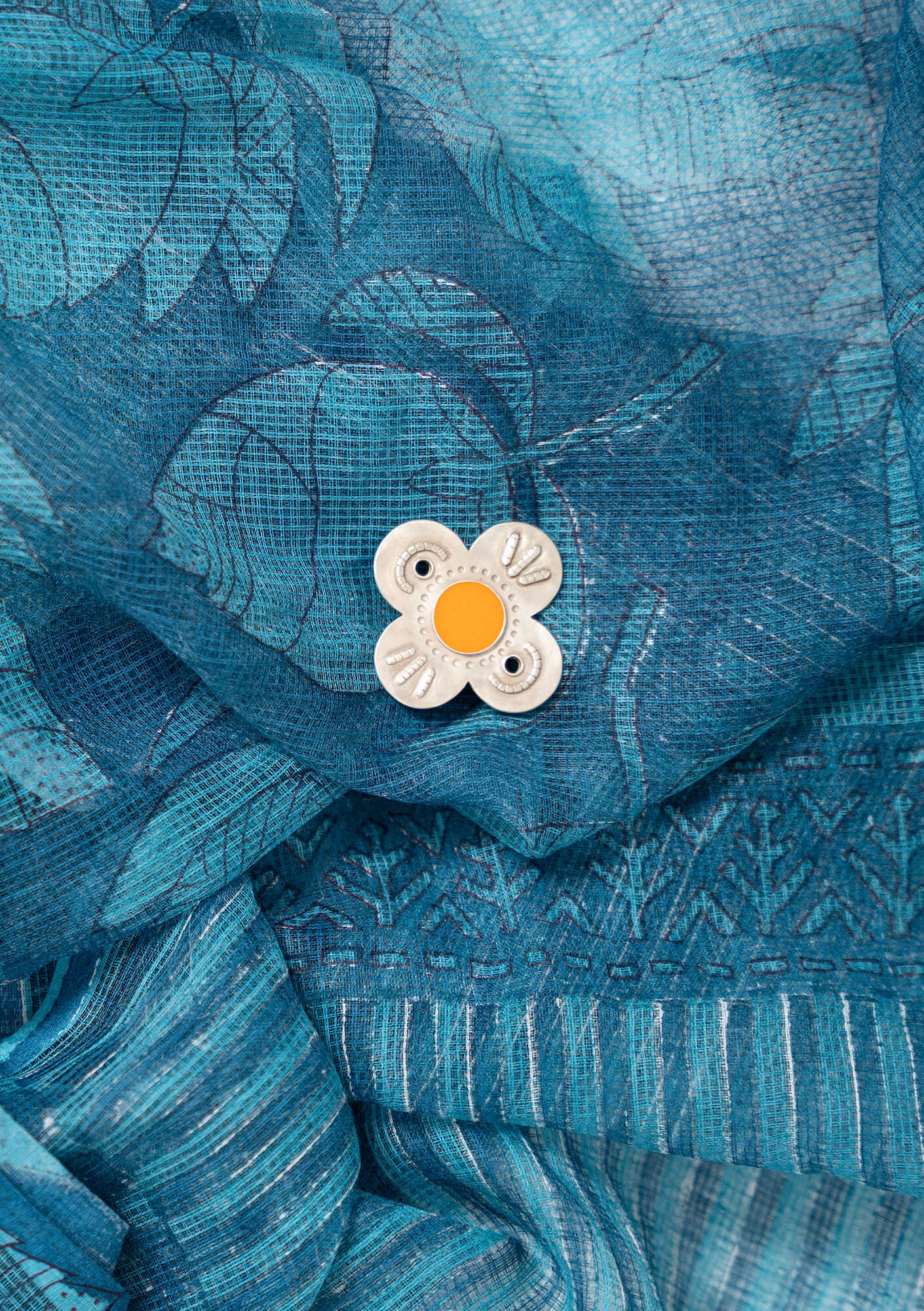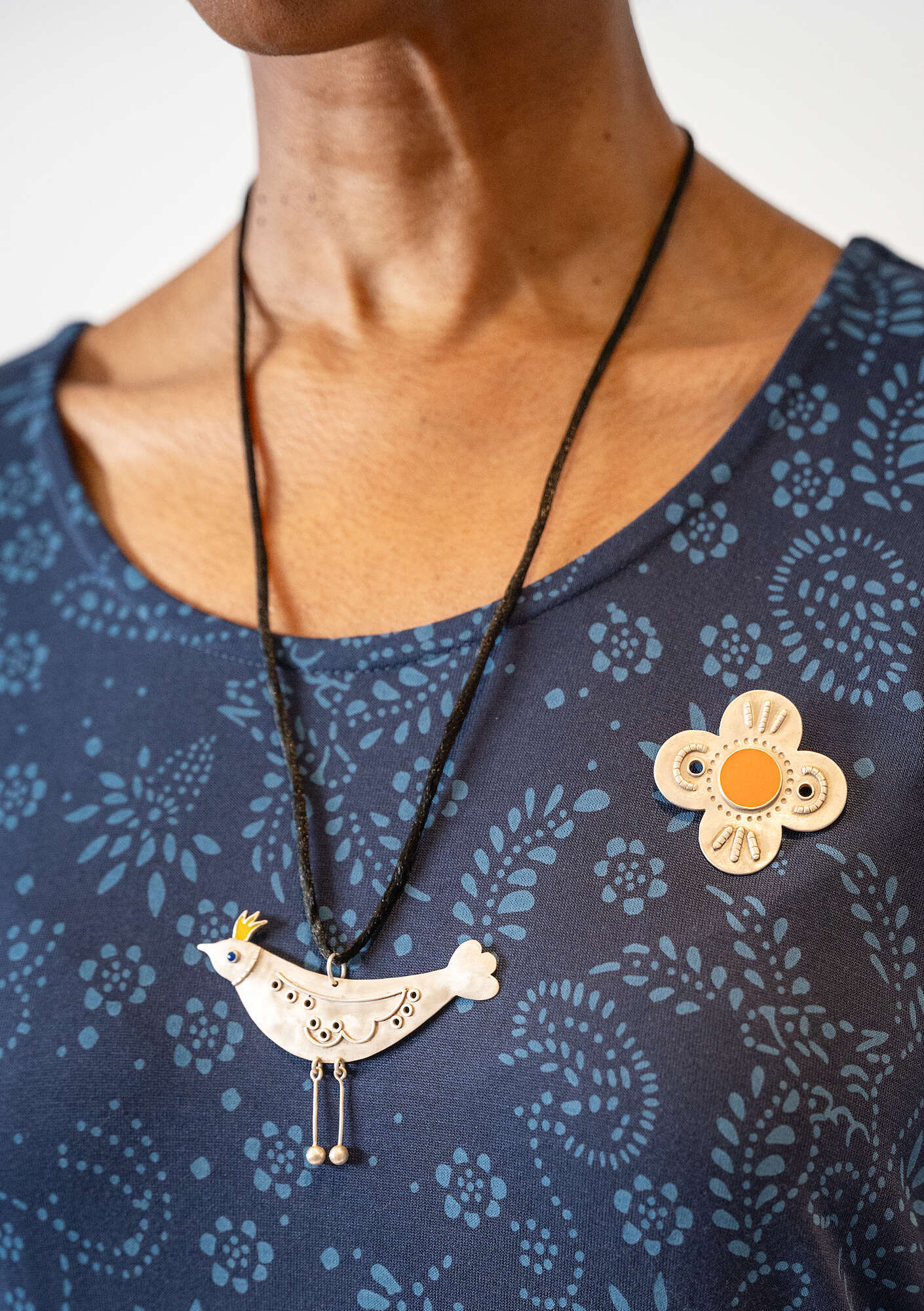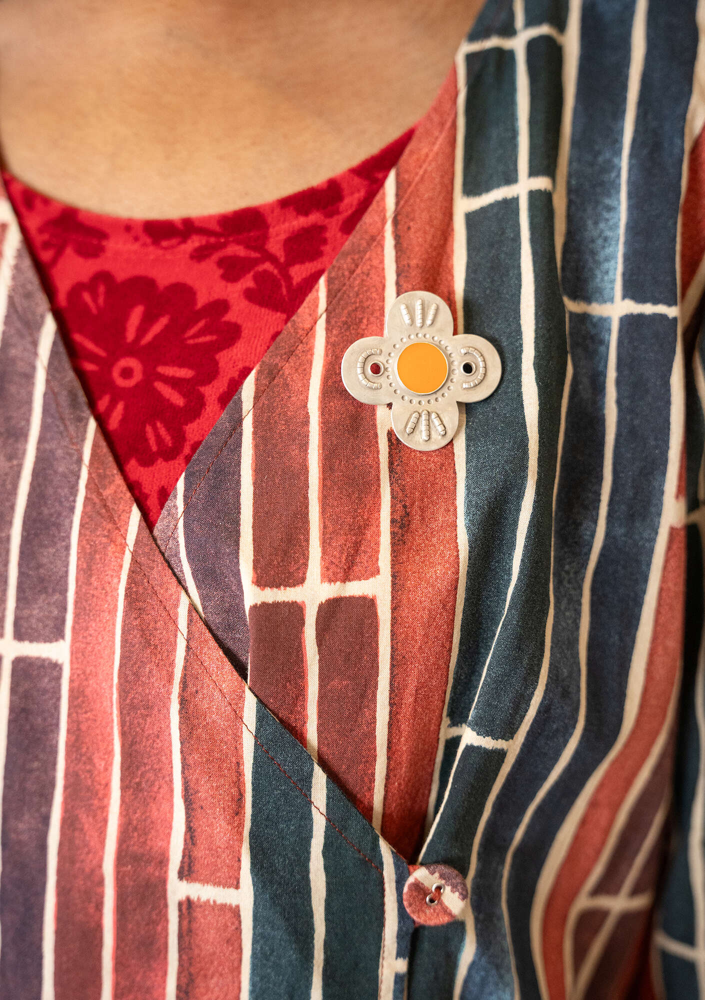 - Decorative, classic Gudrun flower brooch in 925 sterling silver, relief with enamel details. The perfect accessory for both daily wear and parties. Easy to put on with a pin on the back. Comes in a small printed cloth bag.Size and Measurement