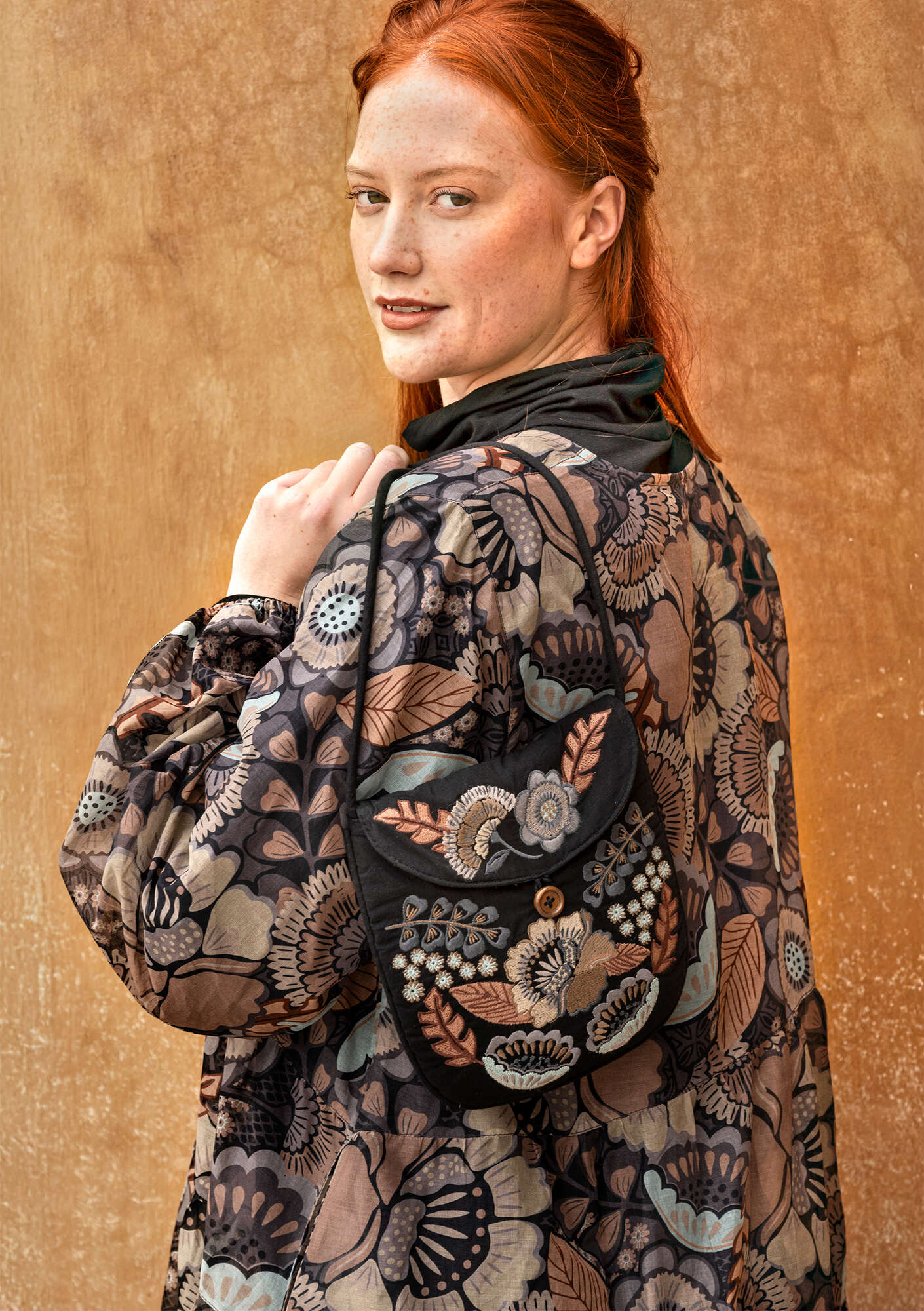 - Embroidered cotton bag, lined inside. Round shoulder strap and a flap with a simple wooden button closure.Size and Measurement