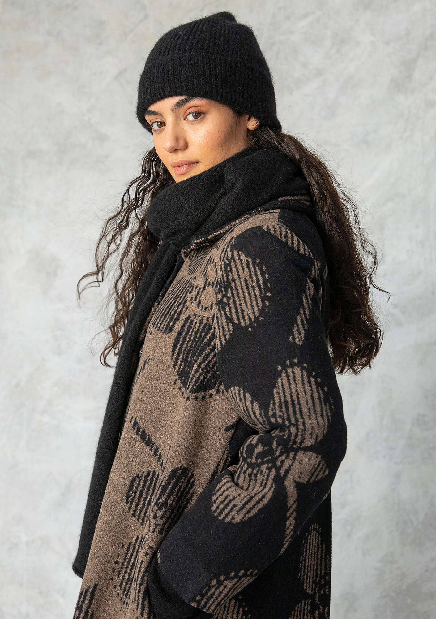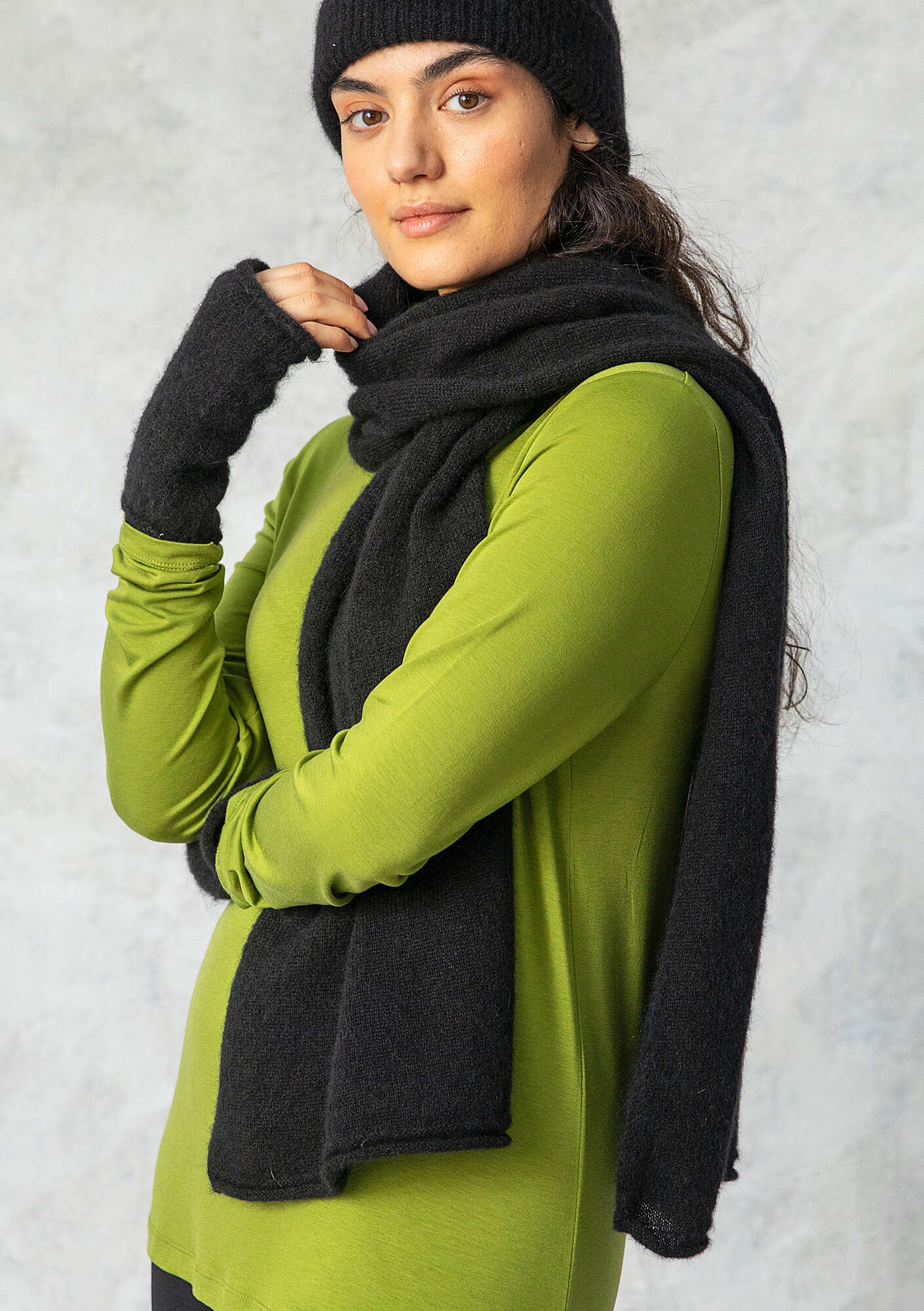 - 50% alpaca/28% polyamide/22% wool. The polyamide is certified recycled. The wool is mulesing-free. Wool may pill after repeated wear. Carefully remove any pilling. We suggest airing this garment or steaming with an iron. As a last option, hand wash cold or wash in the washing machine set to the wool-wash cycle. Use wool detergent. Gently reshape while damp. Dry flat. Store flat. Shrinkage 4-5%. Made in Petrich, Bulgaria.