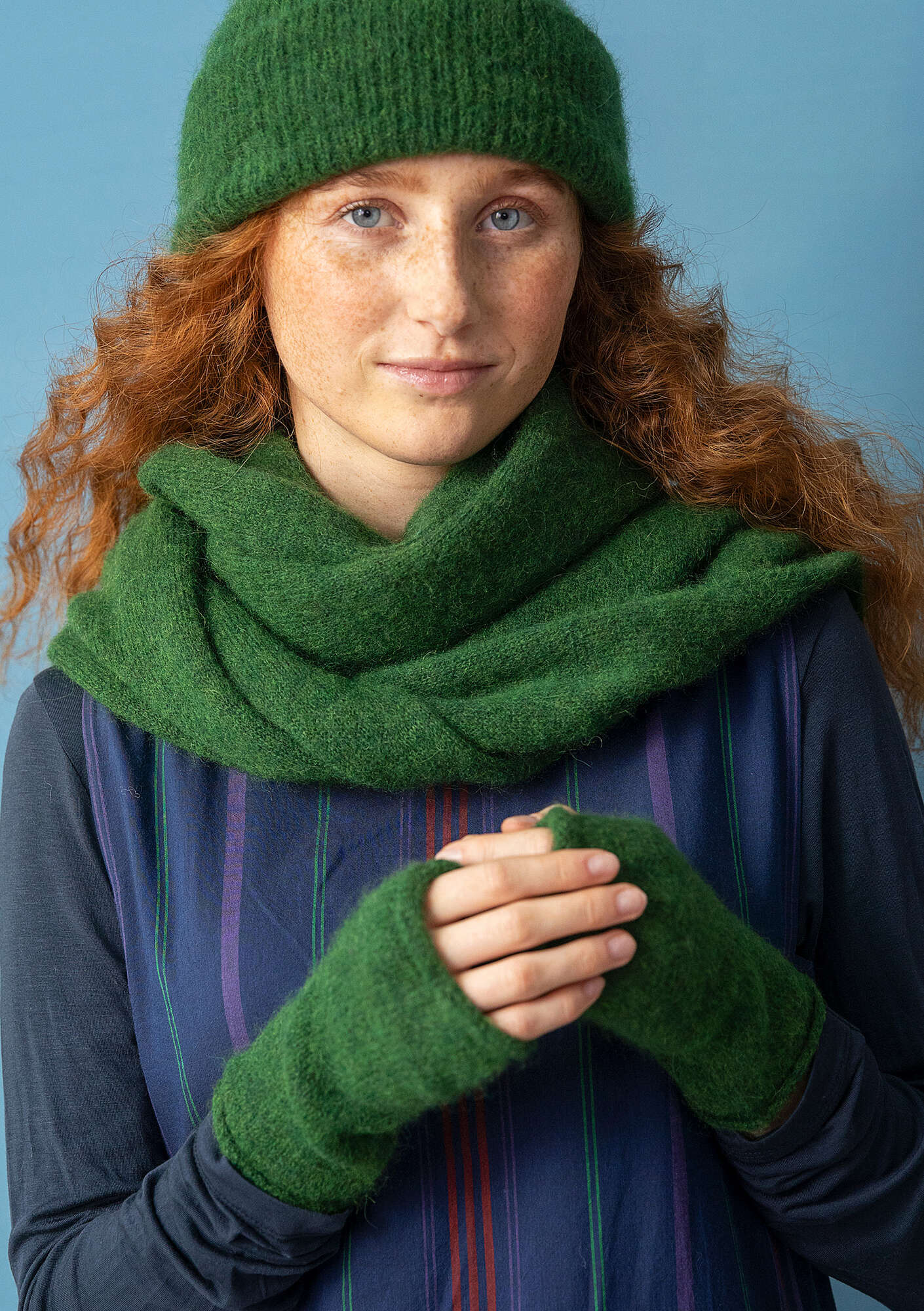 - A delightfully fluffy scarf that is warm and wonderful to wear. Knit in an alpaca and wool blend. Finished with little rolled edges at the short sides. Size and Measurement